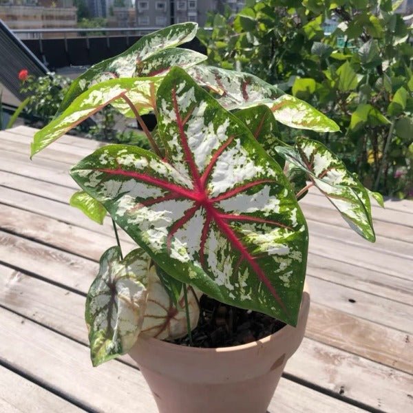 慶典彩葉芋整個夏天和秋天都保持美麗。此外,每片葉子都以白色五彩紙屑斑點、爵士綠色邊緣和深紅色葉脈打扮,給人留下深刻印象。