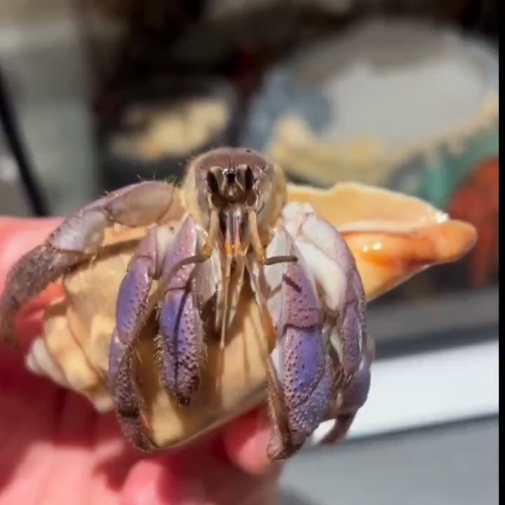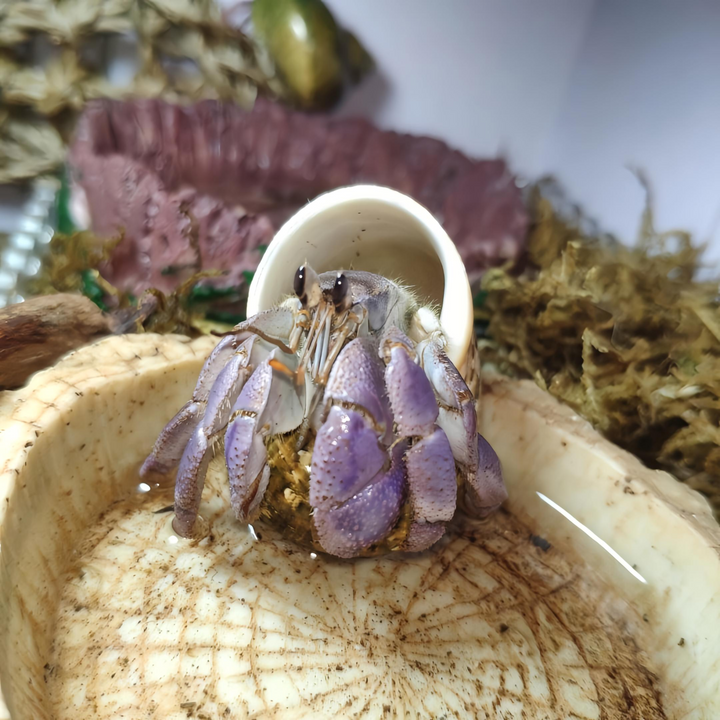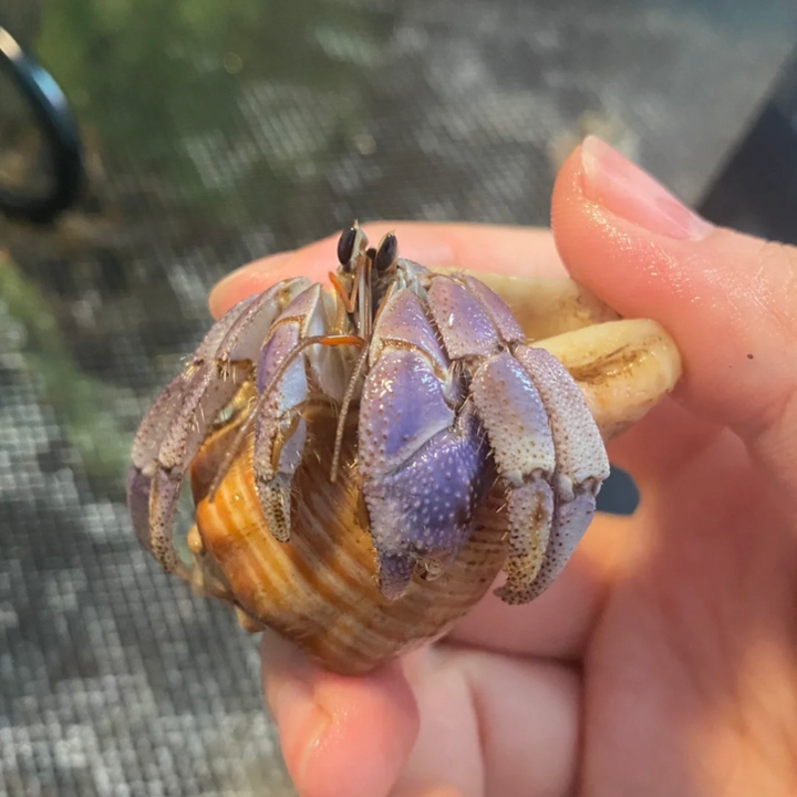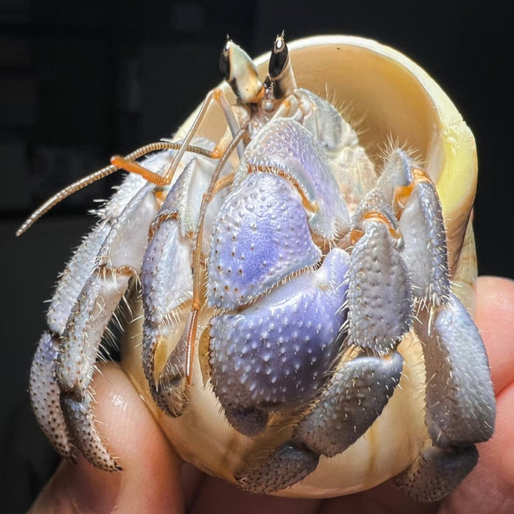 仙女里拉寄居蟹以其夢幻的體色聞名,成體呈現淡紫色、深紫色,部分個體帶有金屬光澤,觸角內側為鮮明的橘紅色,眼柄呈方形且無黑斑,外觀優雅獨特。牠們的背甲帶有黑色扇形斑塊,左螯佈滿斜向顆粒與剛毛,整體散發神秘而精緻的美感。原產於新加坡、印尼及馬來西亞的沿海地區,是該區域極具觀賞價值的寄居蟹品種。