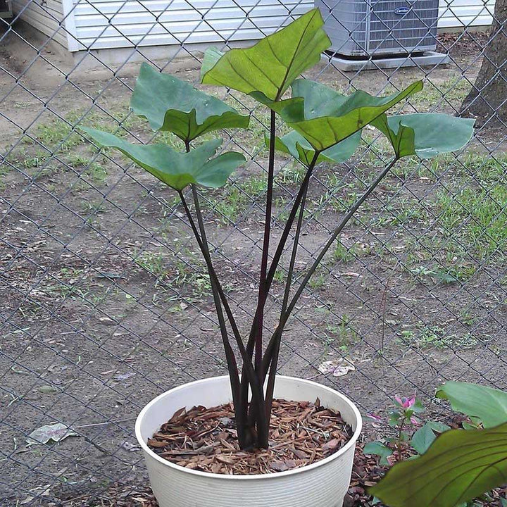 Colocasia esculenta 'Coffee Cups' has dark, almost black, stems and large upward cupping, deep green leaves. Colocasia 'Coffee Cups' is a vigorous variety of Elephant Ears that may reach 6' in height and 3'-5' wide.