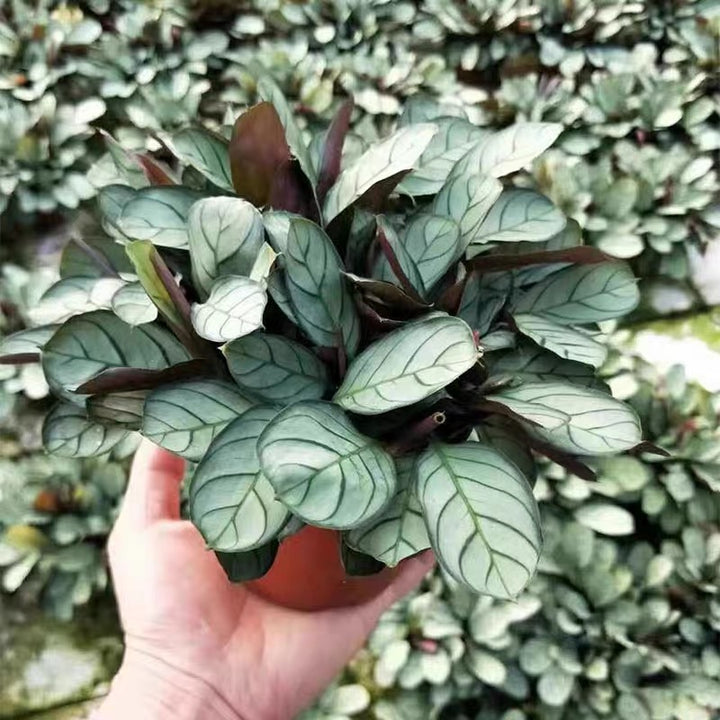 Ctenanthe 'Amagris' has silvery green leaves that have a delicate dark green herringbone pattern and purple undersides. Like the parent plant, the Ctenanthe 'Amagris' has a delightfully compact growth form and a habit of raising its leaves at night and lowering them during the day, earning it a place amongst the "prayer plants."
