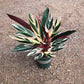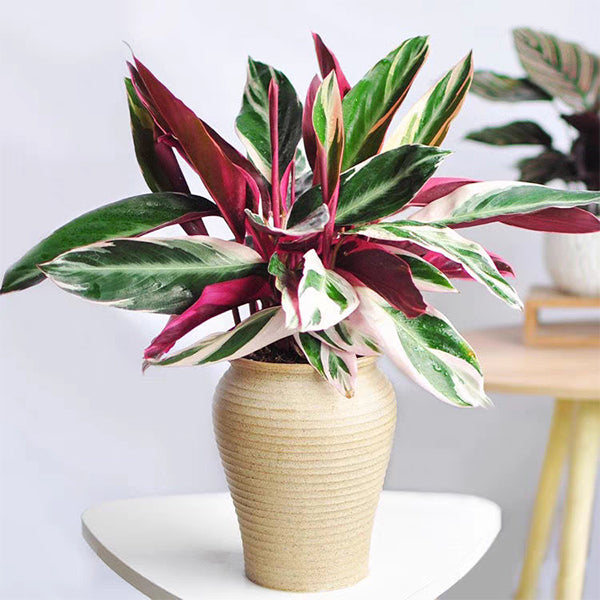 Ctenanthe oppenheimiana, the giant bamburanta or never never plant, is a species of flowering plant of family Marantaceae and is a native of Brazil. It is an evergreen perennial. This plant can grow to more than 1 m (3.3 ft) tall and broad, with long narrow leaves up to 40 cm (16 in) in length. These are dark green, heavily and irregularly marked with cream stripes, and wine-red on the undersides (hence 'Tricolor').*