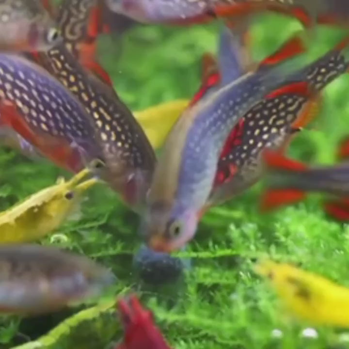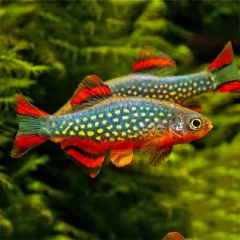 体表有深蓝的底色加上密布的金点花纹,除了胸鳍外的各鳍都略有鲜艳的橘红色特别是在公鱼身上的颜色表现更是令人惊豔,母鱼就比较朴素。