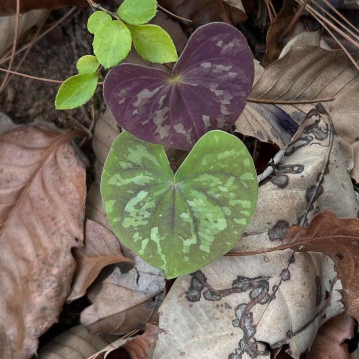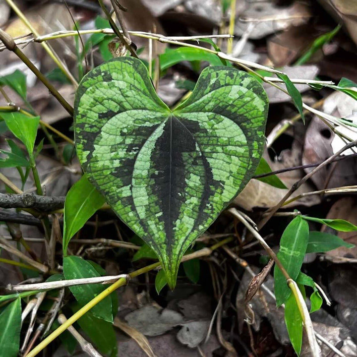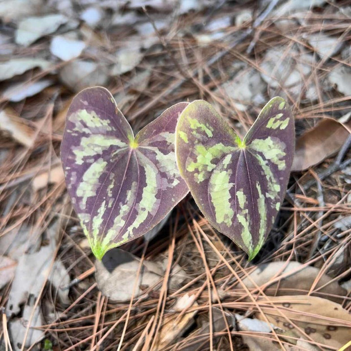 異色山藥是一種逆時針纏繞的觀賞性熱帶藤本植物,因其色彩斑斕的葉子而種植。尖心形的葉子有豐富的圖案和深綠色、淺綠色和白色的大理石花紋,葉面有銀色中脈,葉背有紅紫色。