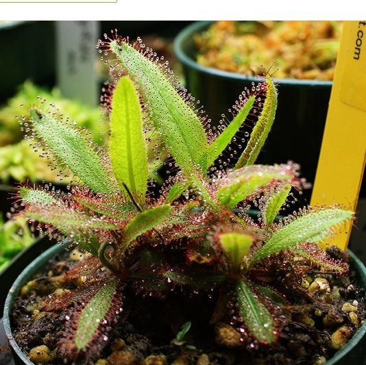 Tentacle movement in this species, unlike other Drosera, is minimal and slow to the point of being barely noticeable. The leaves are narrowly lanceolate and are typically 10–25 cm (4–10 in) long and 7–10 mm wide.