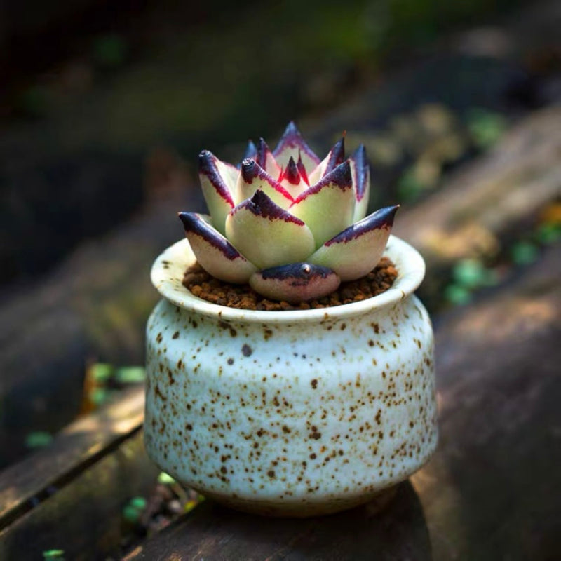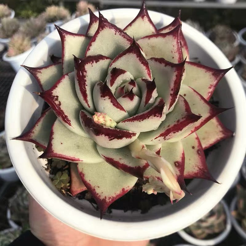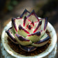 東雲是景天科擬石蓮花屬的多肉植物,原產於墨西哥乾燥地區。其葉片呈緊密的蓮座狀排列,葉形三角錐狀,尖端銳利如龍舌蘭。植株外型優雅且富層次感,適合單盆栽種。東雲生長速度中等,成株偶爾會從側芽分株,形成群生狀態,增添觀賞價值。其強健的特性與神秘色調,深受多肉愛好者青睞。