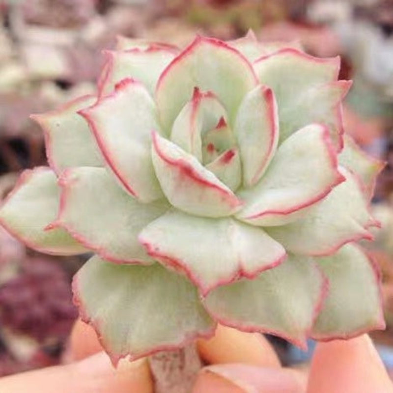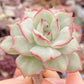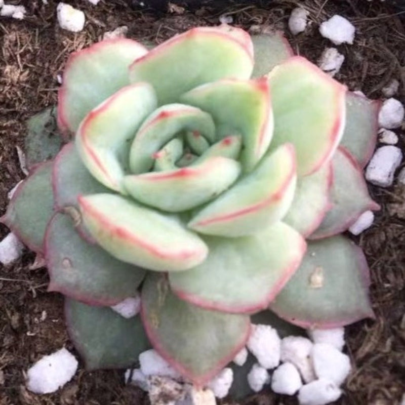 織錦為景天科擬石蓮花屬多肉植物,是加州女王的錦斑變異品種,經典蓮座的小型多肉,葉子白綠色,葉片卵形,被白霜,具葉尖,葉片表面不光滑,有點石化的感覺。在光照充足、溫差較大的環境中葉子邊緣呈線條狀紅色,植株宛如一朵盛開的玫瑰,非常迷人。