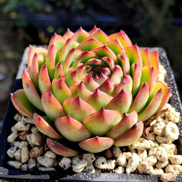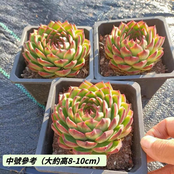 月亮石是景天科擬石蓮花屬的迷人品種,葉片呈現紅綠漸變的獨特色澤,與多肉吉娃娃有些相似。葉片肥厚呈蓮座狀排列,葉緣處色彩較深,向中心漸變為明亮的色調,在適宜環境下會展現出鮮明的對比效果。