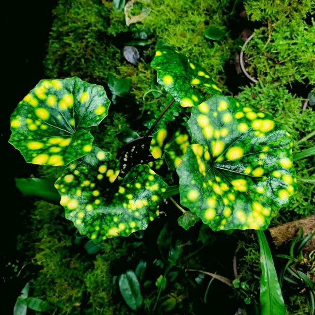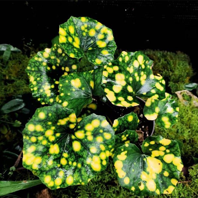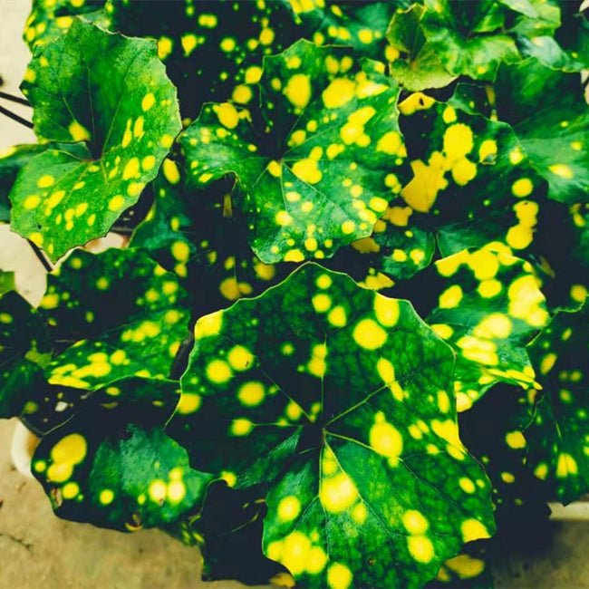 Farfugium japonicum 'Auremaculatum' foliage is bold, round, shiny green, wide leaves are spotted with yellow dots, similar to a leopard skin.