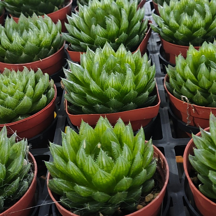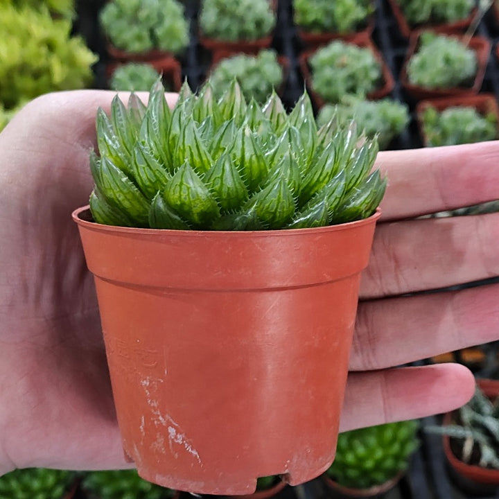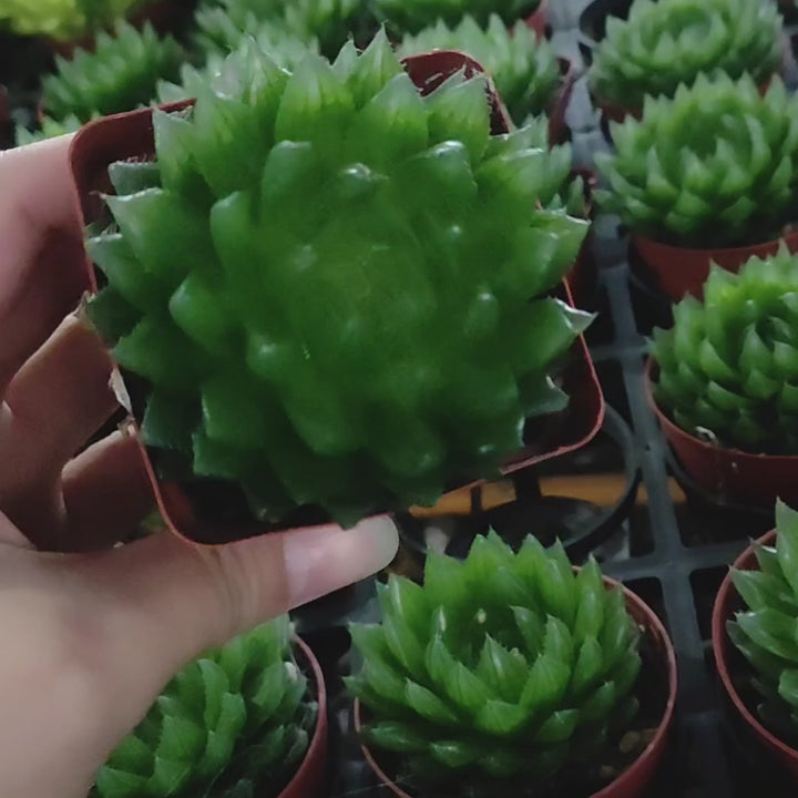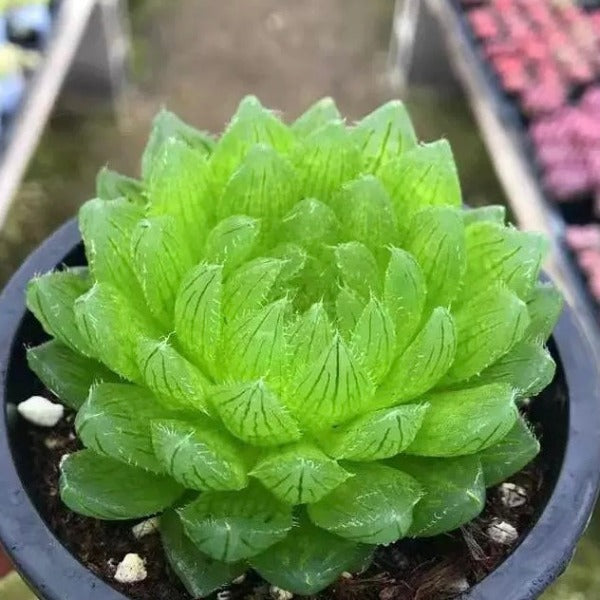 櫻水晶是百合科十二卷屬的經典品種,以其晶瑩剔透的葉片頂端著稱。葉片緊密排列成蓮座狀,頂部呈半透明狀,在適宜光線下會呈現如水晶般的透亮質感。植株嬌小玲瓏,適合擺放在辦公室或窗台等室內明亮處,能為空間增添清新脫俗的氣息。