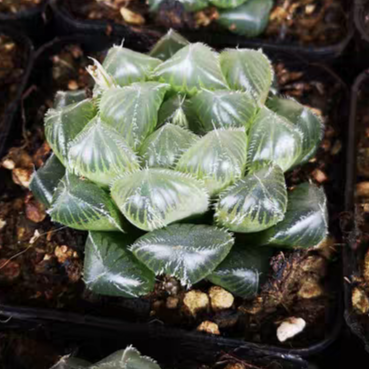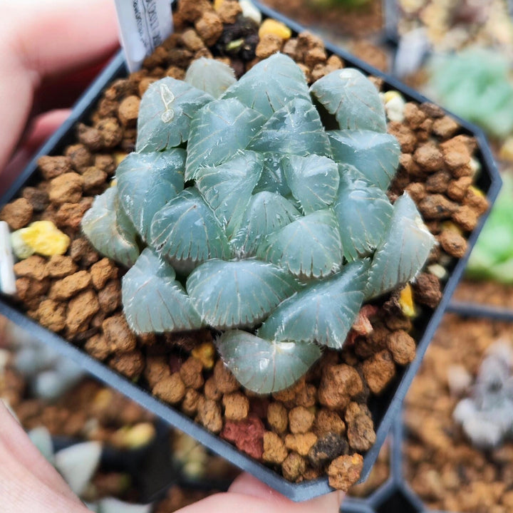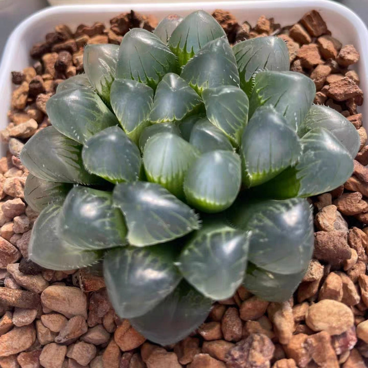 藍鏡玉露是百合科十二卷屬的經典植物,它的特點為晶瑩剔透的窗狀葉片,葉色呈現獨特的藍綠調,在光照下會泛起金屬光澤,葉緣整齊排列著短小絨毛。植株呈標準緊湊蓮座形,葉瓣肥厚飽滿,如同藍寶石一樣。生長速度緩慢但易群生,對環境適應性強,適合擺放於窗臺、辦公桌等室內空間,是多肉收藏者必入的優雅品種。