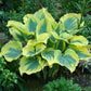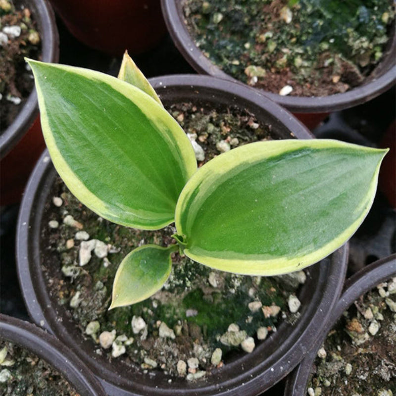 自由玉簪花大型品種,以其高大的身軀和寬闊的黃邊葉片為特點,其葉柄長而有力,可以長到近1米,使其成為大型玉簪中的佼佼者。葉片擁有藍心大黃邊的獨特色彩,小苗時期黃邊不明顯,但隨著時間推移,黃邊會逐漸變寬。