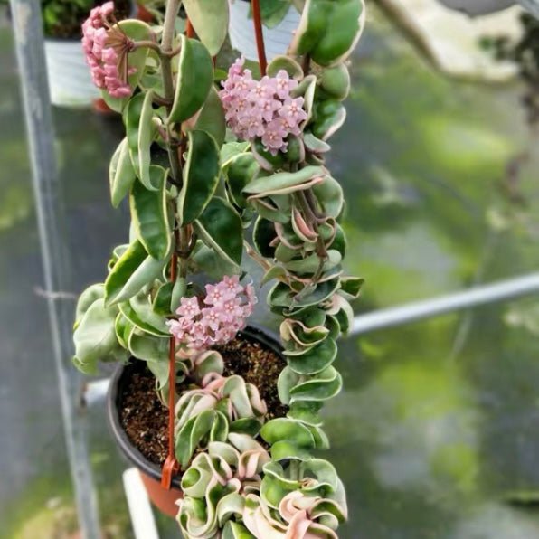 Hoya carnosa compacta is a vining epiphytic plant in the family Apocynaceae.It is native to the East Asia and Australia.The inflorescence is made up of multiple flowers in a group of umbel. The inflorences are peachy-white, star-shpaed with white centers. The flower's surface fuzzy beacuse it is covered by tiny hair. They are heavily scented with a sweet fragrance.It has curly leaves and vines similar to thick ropes. The leaves are glossy and waxy .