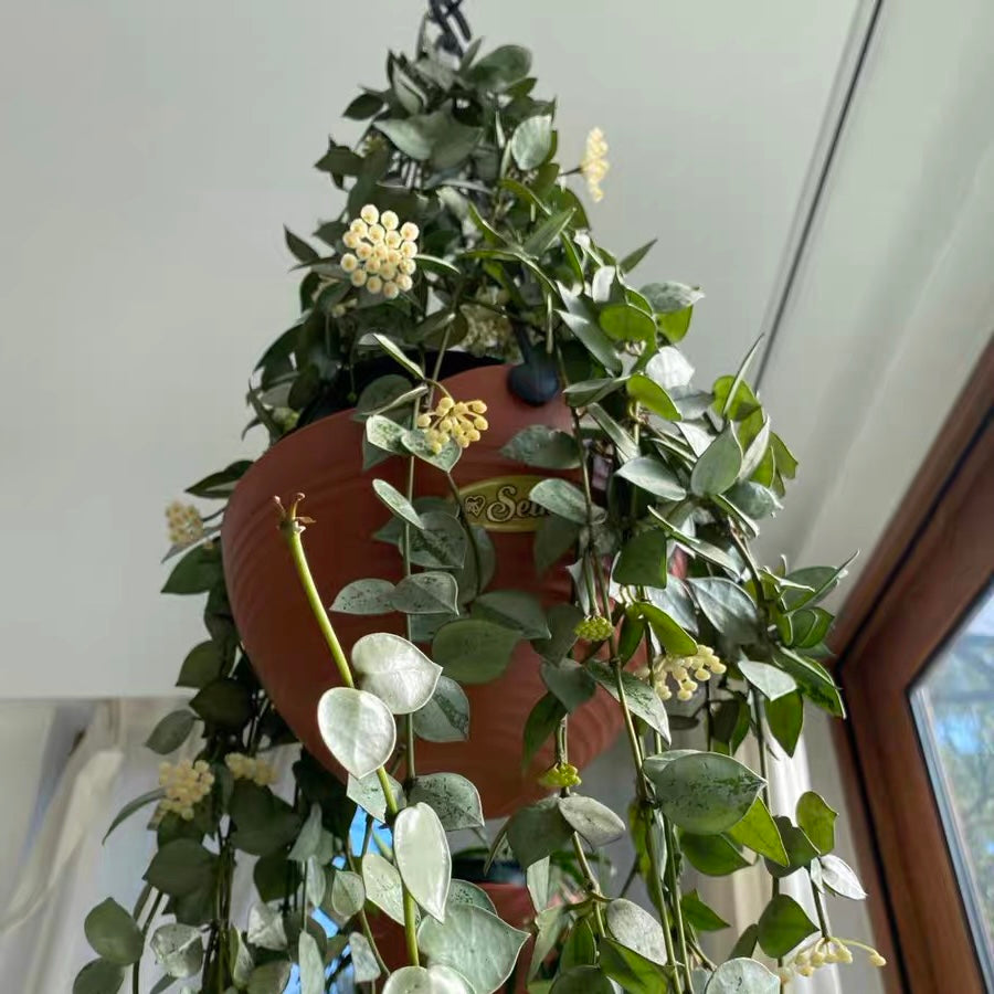 Hoya lacunose silver is a vining epiphytic plant in the family Apocynaceae.It is native to European and Asian countries. The inflorescence is made up of multiple flowers in a group of umbel. The inflorences are creamy , spherical,with yellow centers. They like made up of wax.The flower's surface fuzzy beacuse it is covered by tiny hair. They are heavily scented with a sweet fragrance.