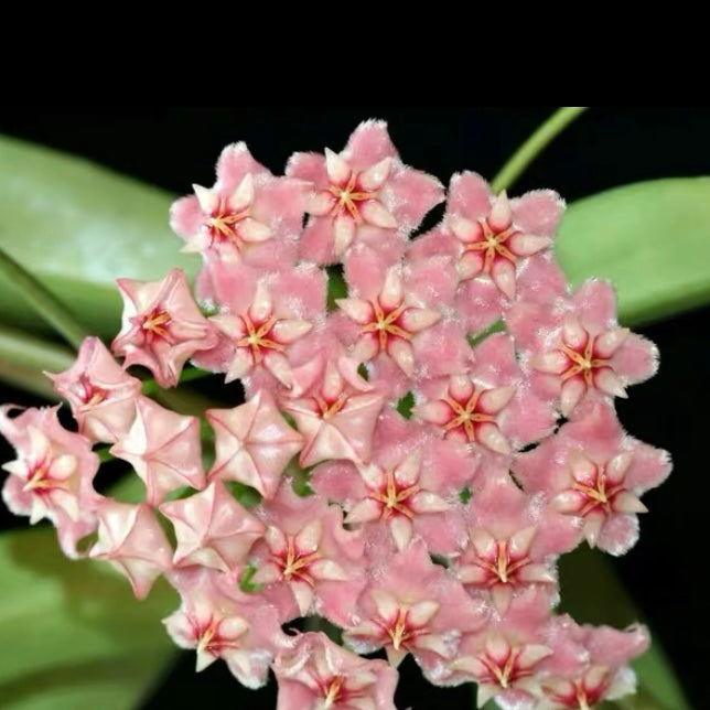 Hoya pubicalyx ' Pink dragon ' is a vining epiphytic plant in the family Apocynaceae.It is native to South East Asia.Pubicalyx is one of the fastest-growing hoya plants.The inflorescence is made up of multiple flowers in a group of umbel. The inflorences are peachy-white, star-shpaed with red centers. The flower's surface fuzzy beacuse it is covered by tiny hair. They are heavily scented with a sweet fragrance. It produces a natural plant pigment “Anthocyanin” to protect young or soft leaves from intense light.