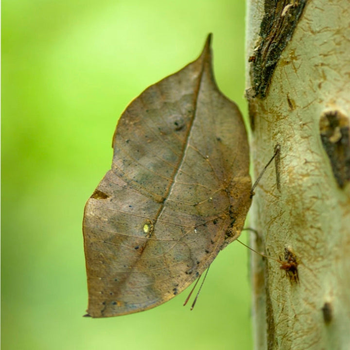 - 翅膀腹面:完美模擬枯葉形態,包括葉脈、黴斑等,堪稱自然界最精妙的擬態