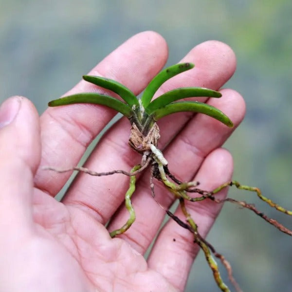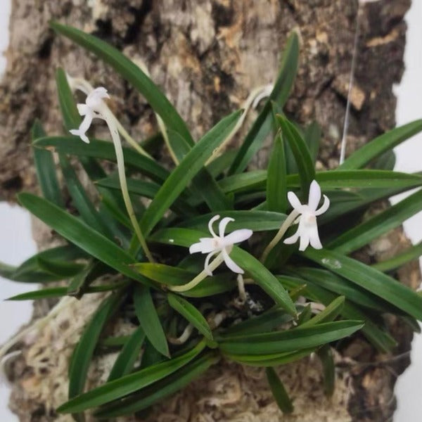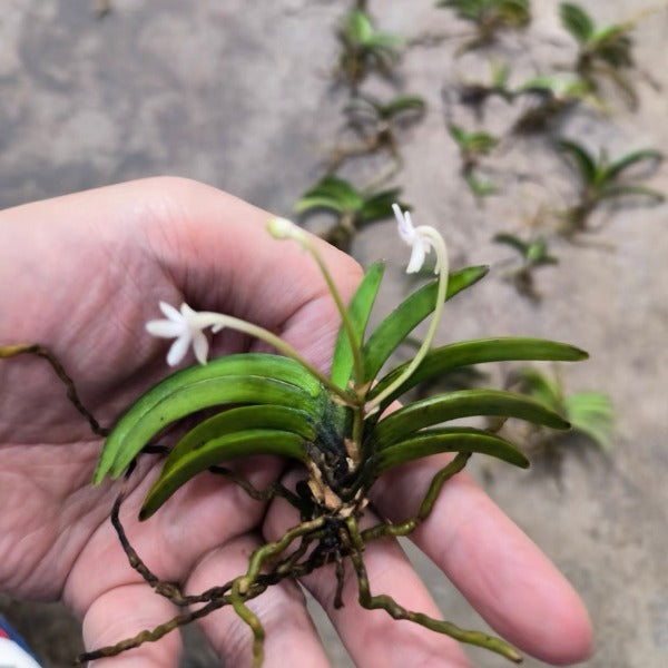 短距風蘭為小型附生草本,具有彎曲發達的氣生根.植株簇生,葉片V字形對折,向外彎曲,花朵白色無香,但萼片和花瓣基部以及子房頂端呈現淡粉紅色,這些特征使得其在蘭科植物中獨樹一幟。