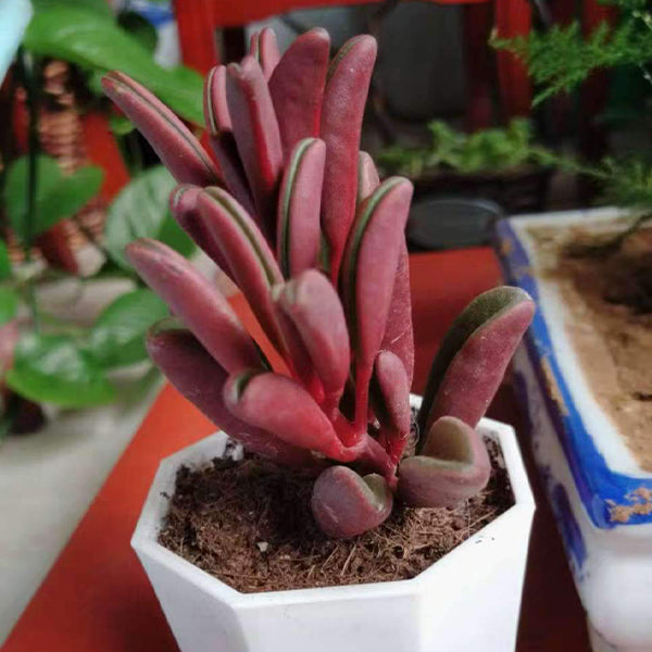 Perennial evergreen fleshy herbs, short plants, 5-8 cm high, fleshy plants, except for dark green leaves, the other parts are red. suitable for warm and dry semi-shady environment, drought resistance, not cold resistance, avoid hot sun exposure and excessive shade, grow well in bright and no direct sunshine. the plant has low requirement for air humidity and can grow normally in dry rooms.