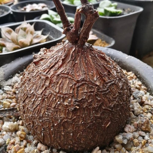 This plant will be in hibernation mode during summer. During summer (May to October), you will be receiving a caudex with no leave and you need to wait till winter for new growth of leaves.