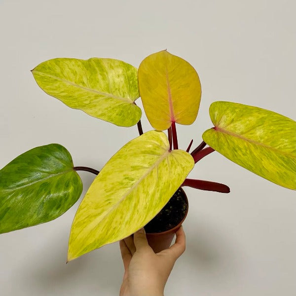油畫女郎蔓綠絨是一種引人注目的植物,有亮粉色的葉柄(連接葉子和莖的莖)和黃綠色的葉子。隨著植物的生長,新葉展開明亮的黃綠色,然後褪色為更深的斑駁綠色。