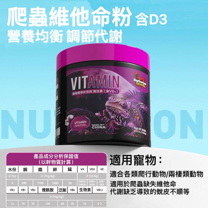 專為爬蟲類寵物研發的爬蟲維維他命,針對蜥蜴、龜類、守宮等不同物種的生理需求,通過黃金比例融合維他命A、D3、B族及鈣等微量元素,精准補充日常飲食難以攝取的關鍵營養。粉質細膩易吸收,可直接撒於飼料表面或混合餵養,為愛寵提供全面均衡的營養支持。