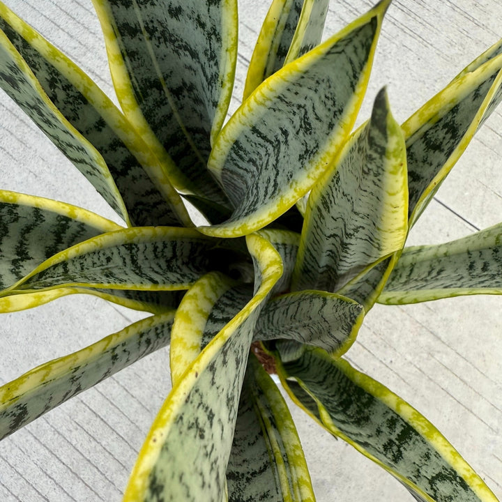 Sansevieria'Golden Hahnii' is a dwarf species of the common Sansevieria houseplant. This particular variety can grow to 8 inches tall and form a low rose shape with upright oval gray-green leaves with dark green cross bands and broad creamy yellow edges.