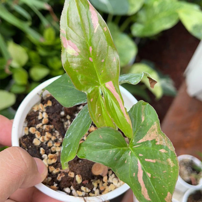 -Syngonium Pink Splash thrives under bright indirect light and well-drained moist soil