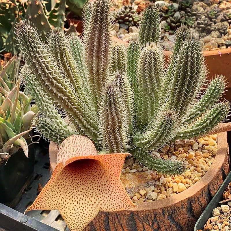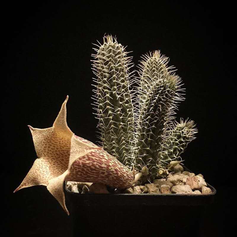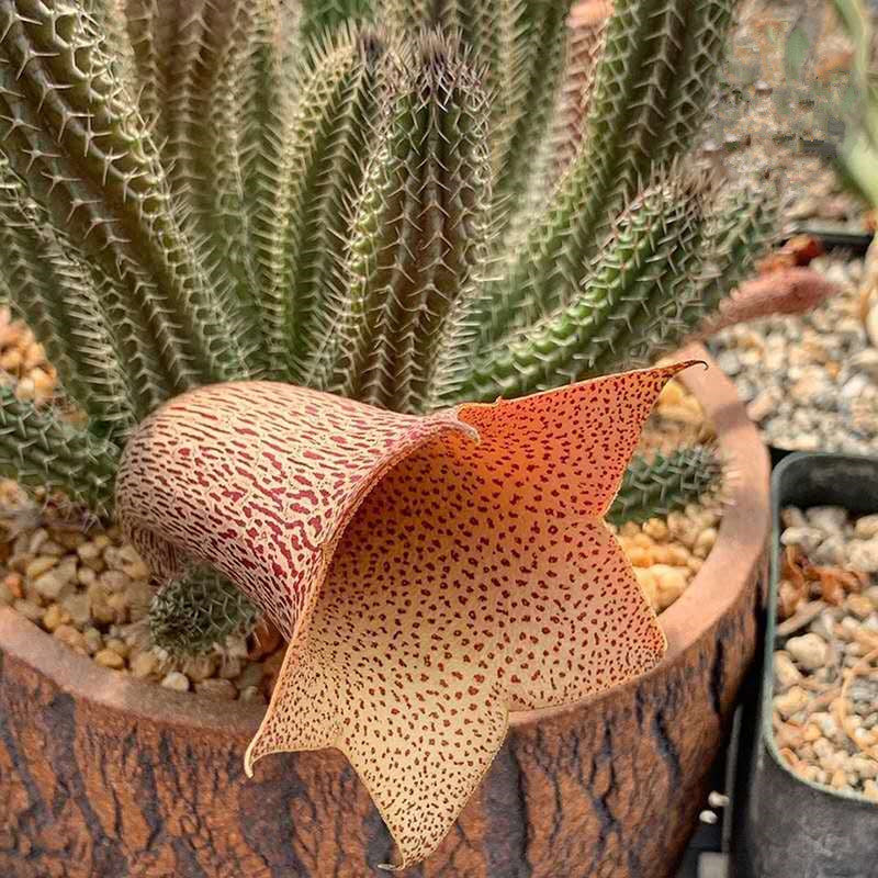 麗鐘閣屬於萝藦科丽钟角属,植株形態酷似仙人掌,花形大而像漏鬥,其独特形态,受多肉植物收藏者青睐。適合盆栽裝飾桌案、幾架、窗臺等處。