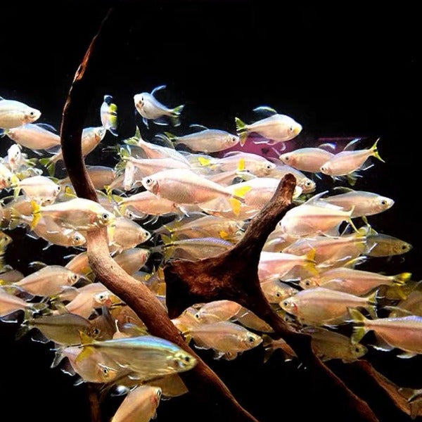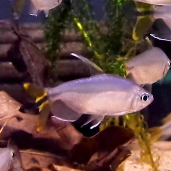 黃尾剛果美人是一種非常有吸引力且不太常見的魚群。它的整體呈銀色,但隨著成熟,會呈現出強烈的虹彩藍色、綠色和金色。