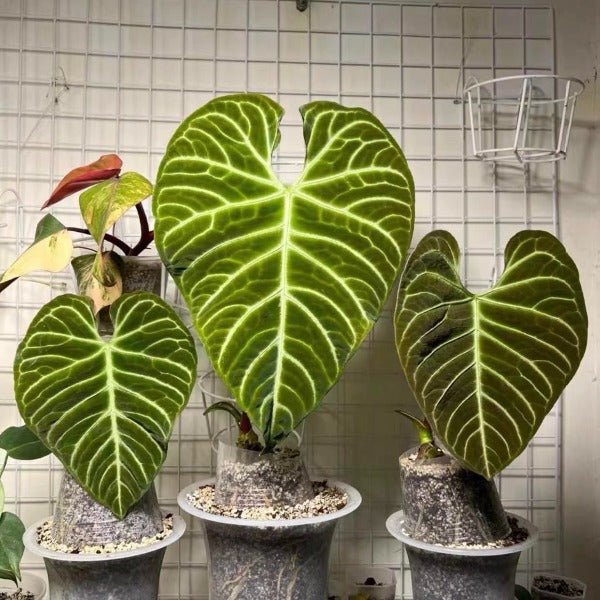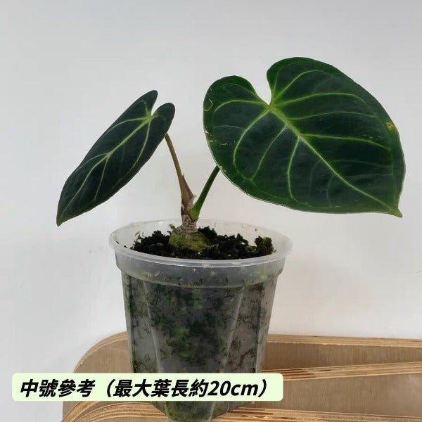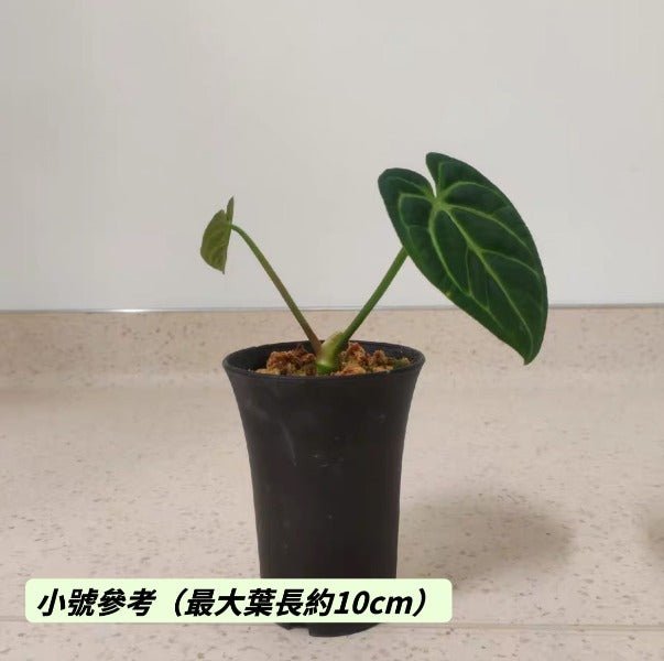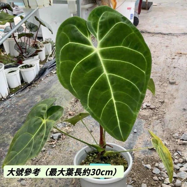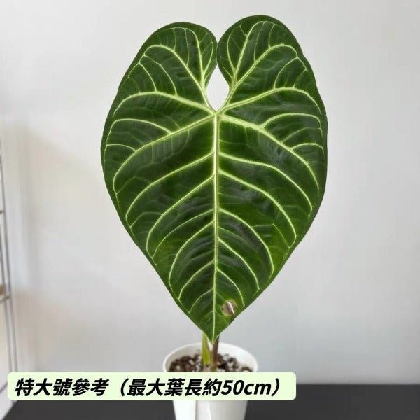 帝王花燭的葉型巨大,質感摸起來像皮革,墨綠色啞光絨面,生長速度較為緩慢,成體葉片立耳型,有腦紋狀紋路,脈絡有螢光效果。