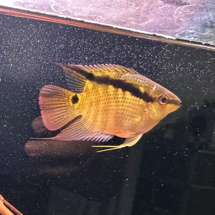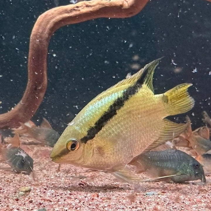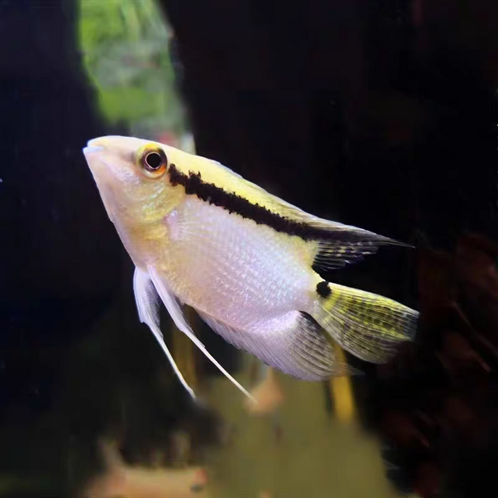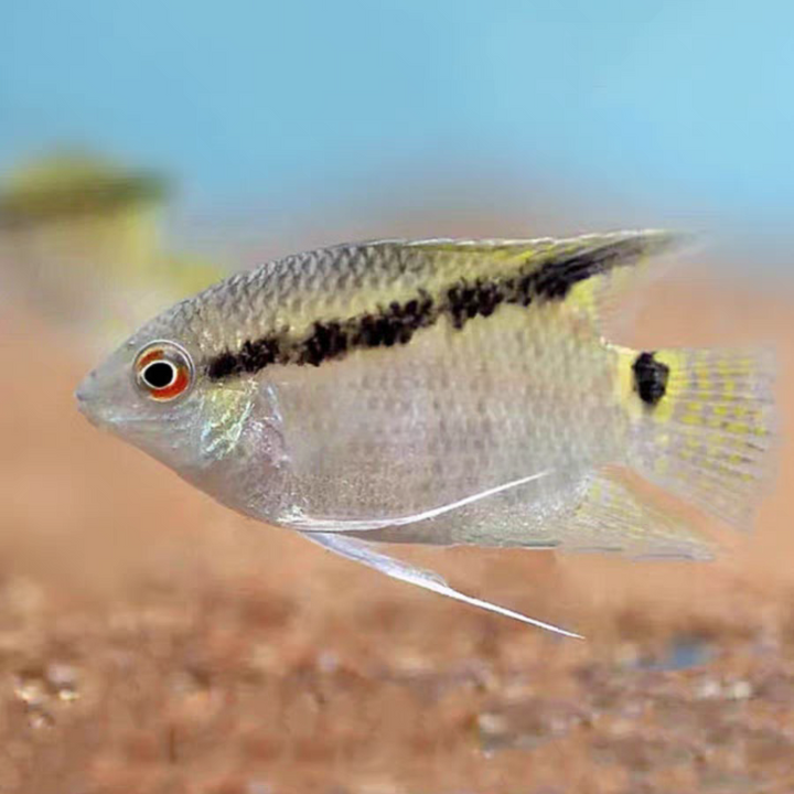 南美畫眉短鯛的體型相對較小,成魚體長通常在12-15cm之間。幼魚體色為銀白色,具有一條醒目的黑色斜紋,從眼部橫穿而過,這也是它們得名 “畫眉”的原因。