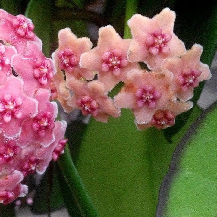 Hoya diversifolia albomarginata is a vining epiphytic plant in the family Apocynaceae.It is native to European and Asian countries. The inflorescence are made up of multiple flowers in a group of umbel. The inflorences are pink,star-shaped,with purple centers. They like made up of wax. They are heavily scented with a sweet fragrance.