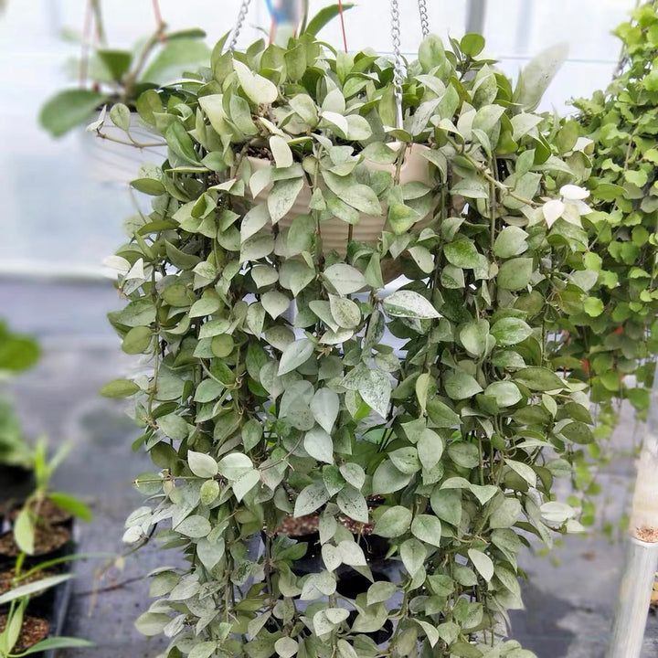 Hoya lacunose silver is a vining epiphytic plant in the family Apocynaceae.It is native to European and Asian countries. The inflorescence is made up of multiple flowers in a group of umbel. The inflorences are creamy , spherical,with yellow centers. They like made up of wax.The flower's surface fuzzy beacuse it is covered by tiny hair. They are heavily scented with a sweet fragrance.