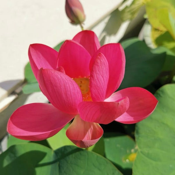 火芙蓉是小型單瓣碗蓮,可微縮,豐花性較好,可結籽,不容易高溫結藕,株型較矮。來賓一號花苞圓潤,花瓣較厚,顏色為正紅色,是小微型品種裏面最紅的,非常推薦喜歡紅色的花友種植!火芙蓉花杆粗壯,葉片厚實濃綠,因而生長較緩慢,開花較晚。