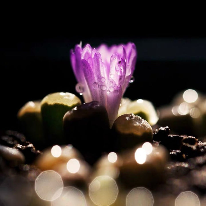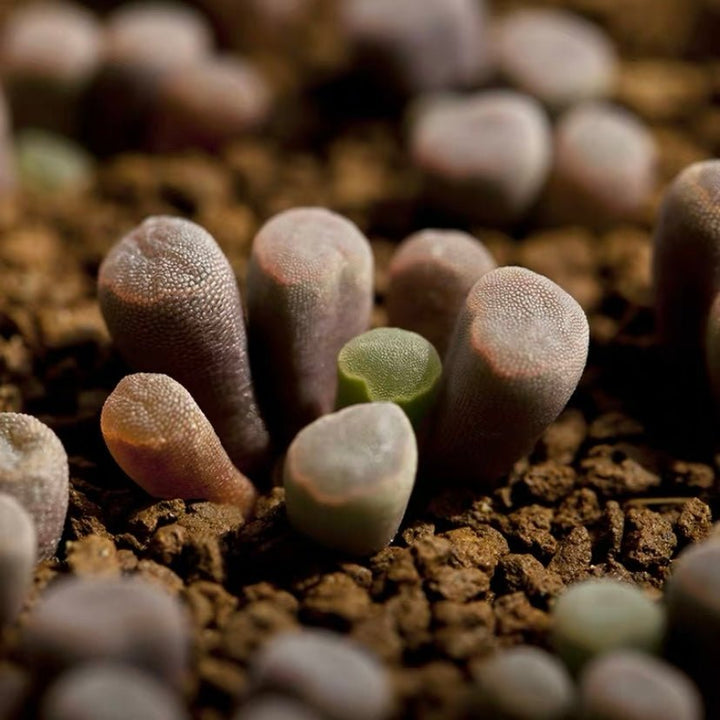 光玉是番杏科光玉屬的珍稀品種,葉片呈圓柱形直立生長,頂端帶有透明的小窗結構,在適宜環境下會呈現淡綠色至粉紫色的漸變色澤。植株低矮緊湊,特別適合用於迷你盆栽或岩石園造景,展現多肉植物的特殊適應形態。