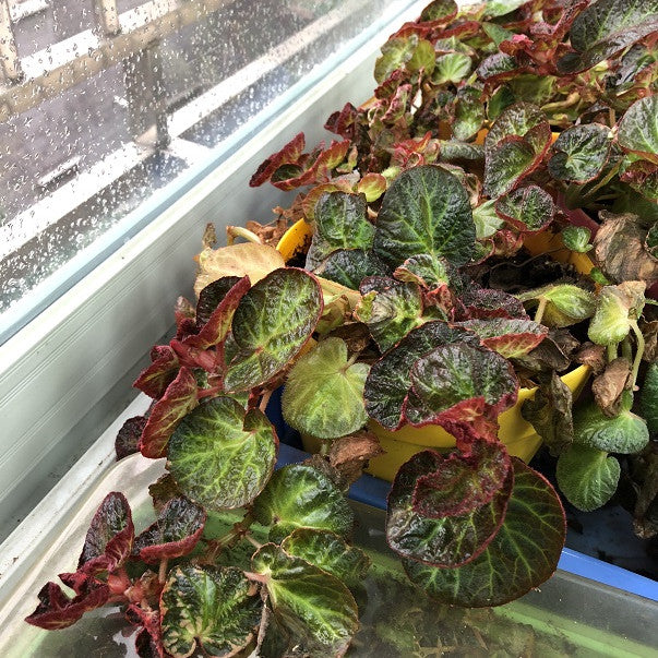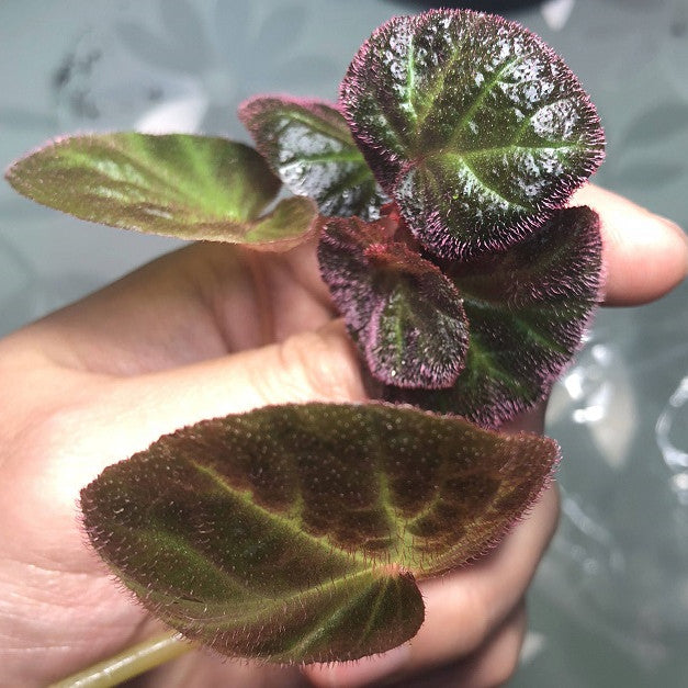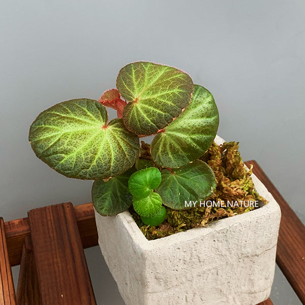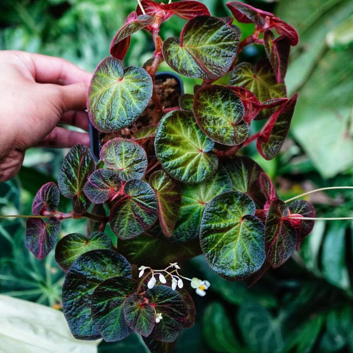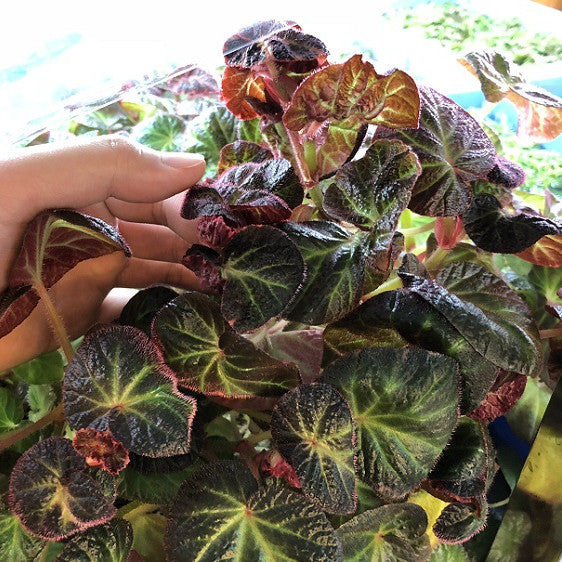 Begonia Bonita Shea A heat-tolerant annual flower grown mainly for its velvety. rounded, curled leaves of deep green on top and rosy-red underneath. It also gets creamy, hanging, bell-shaped flowers in summer.