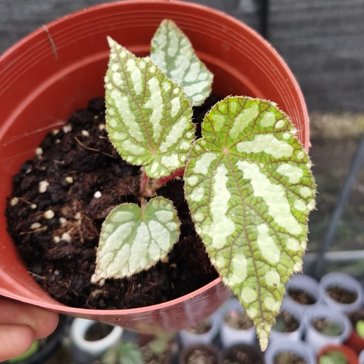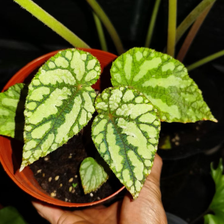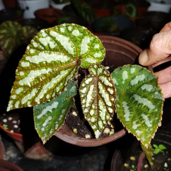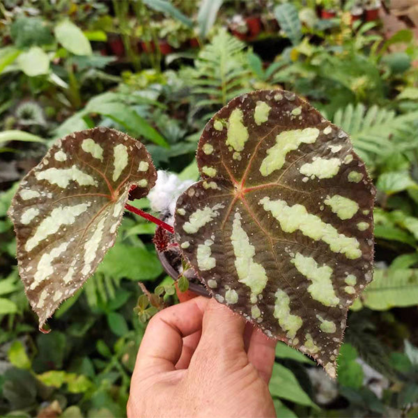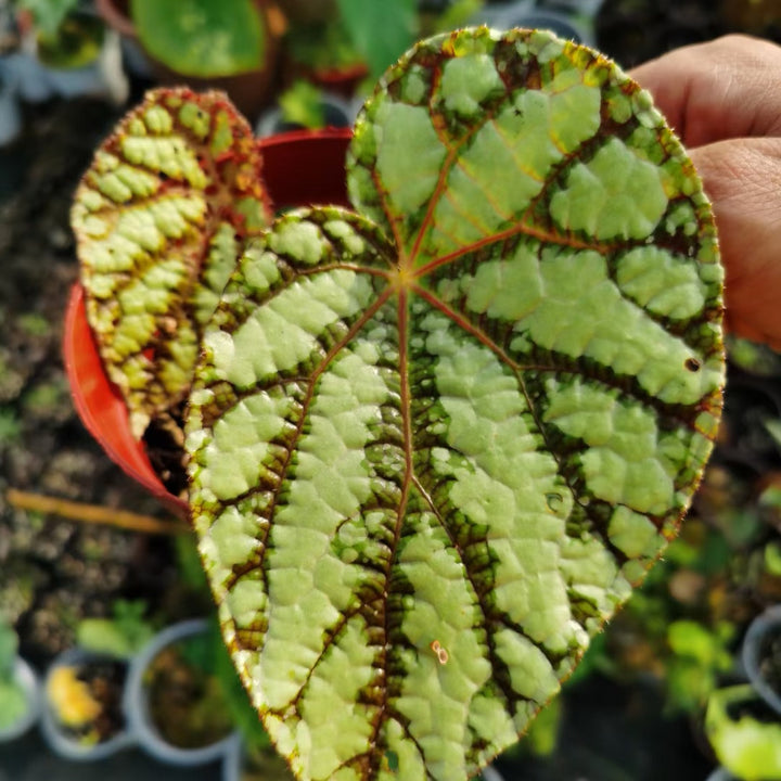 A well grown Begonia xanthina is a stunning plant. However, It is also a variable species whose medium-large foliage can range from green, to green or reddish-green with lighter spots, and even an all-purple-ish leaf form. The mature foliage is always heavy veined and textured. The rhizomatous species bears showy, late season, yellow flowers on medium-tall stems.