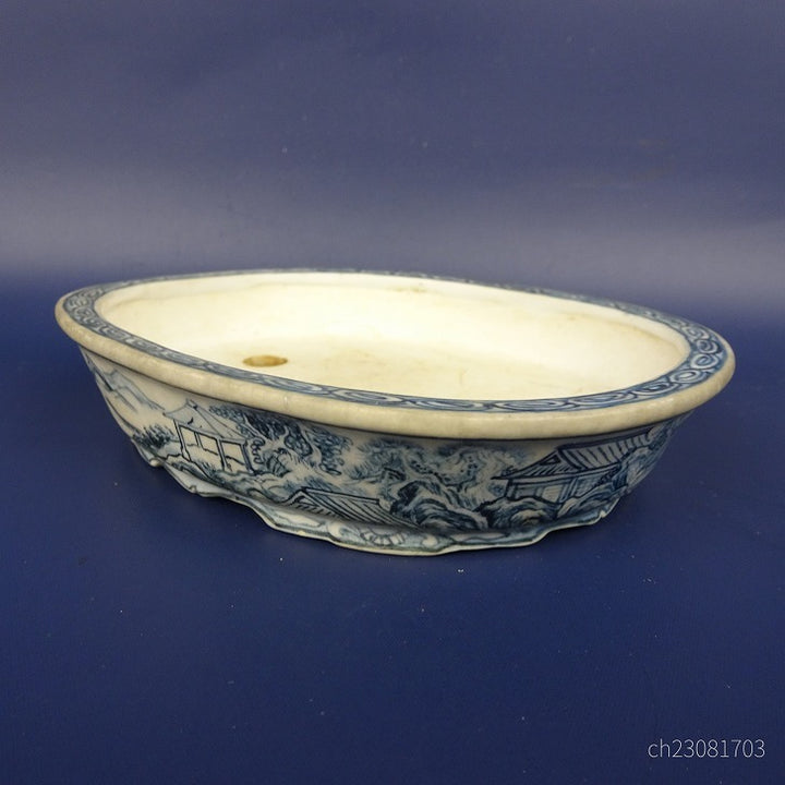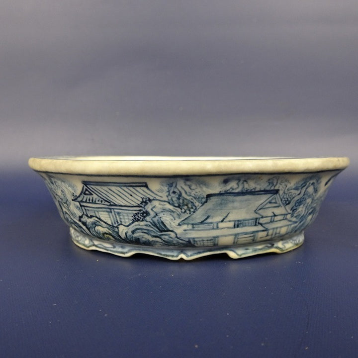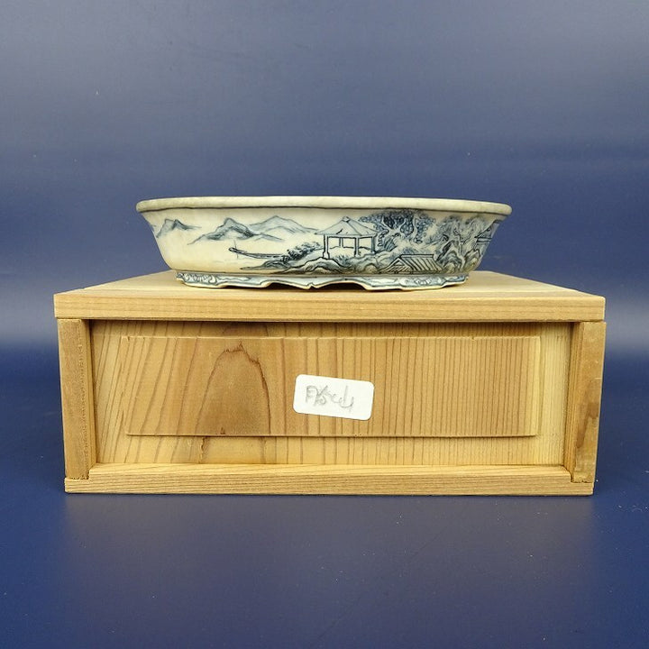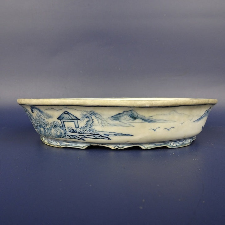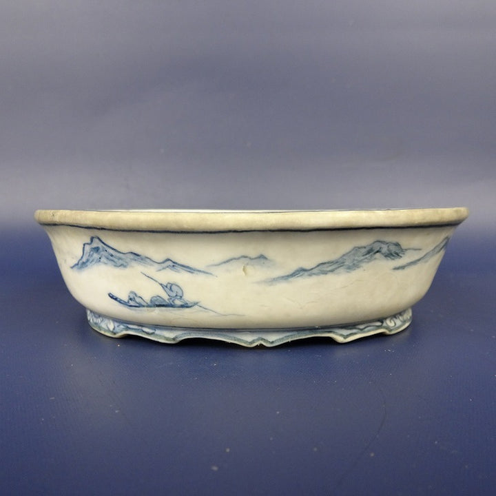 中古盆栽鉢 勝山 小型 長辺 約13.5cm 楕円鉢 外縁 染付 山水図 箱付 中古鉢 h1198426413