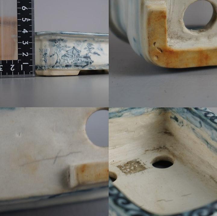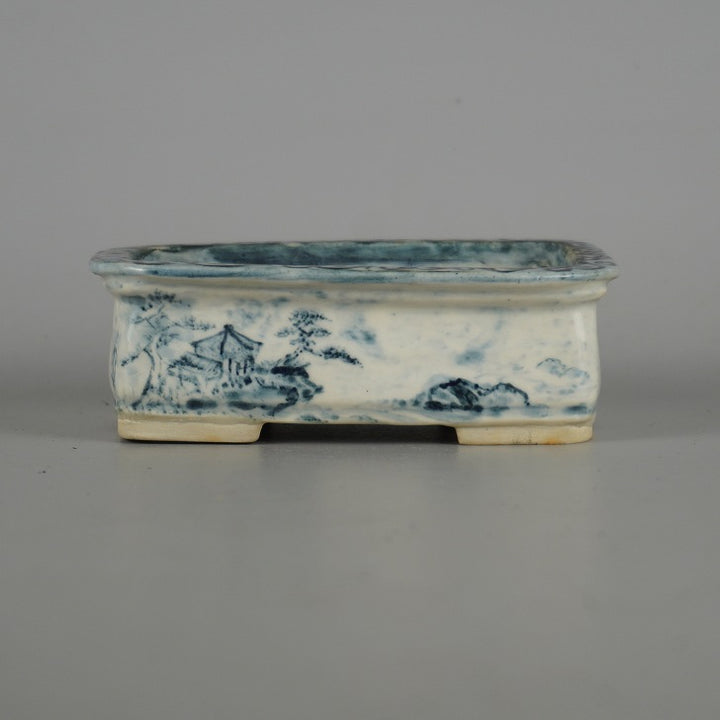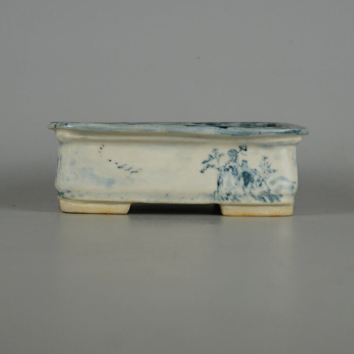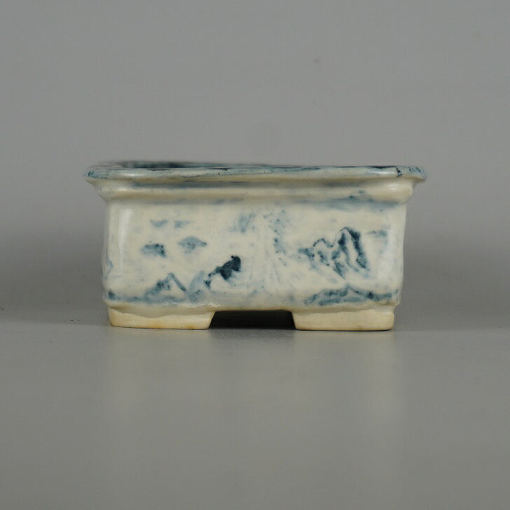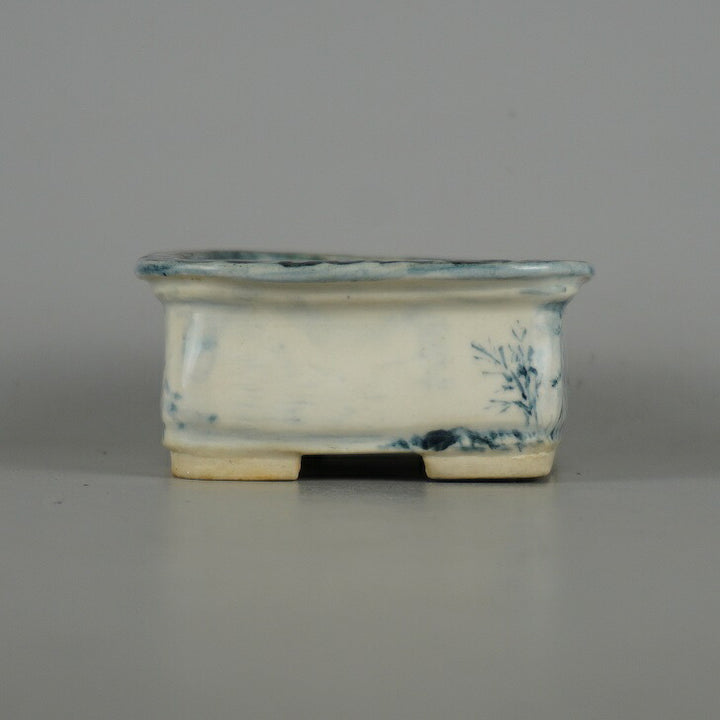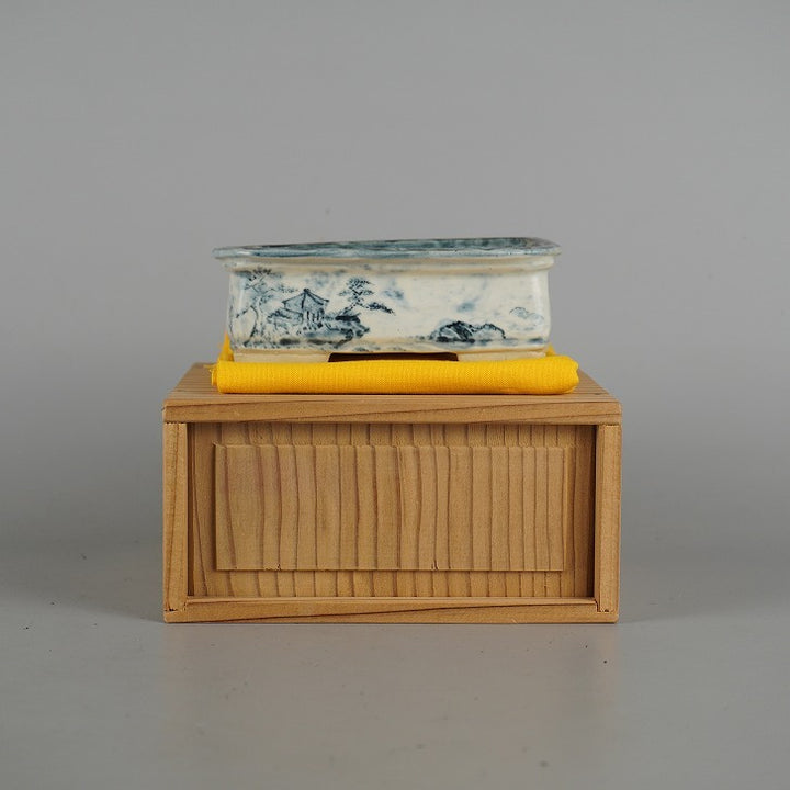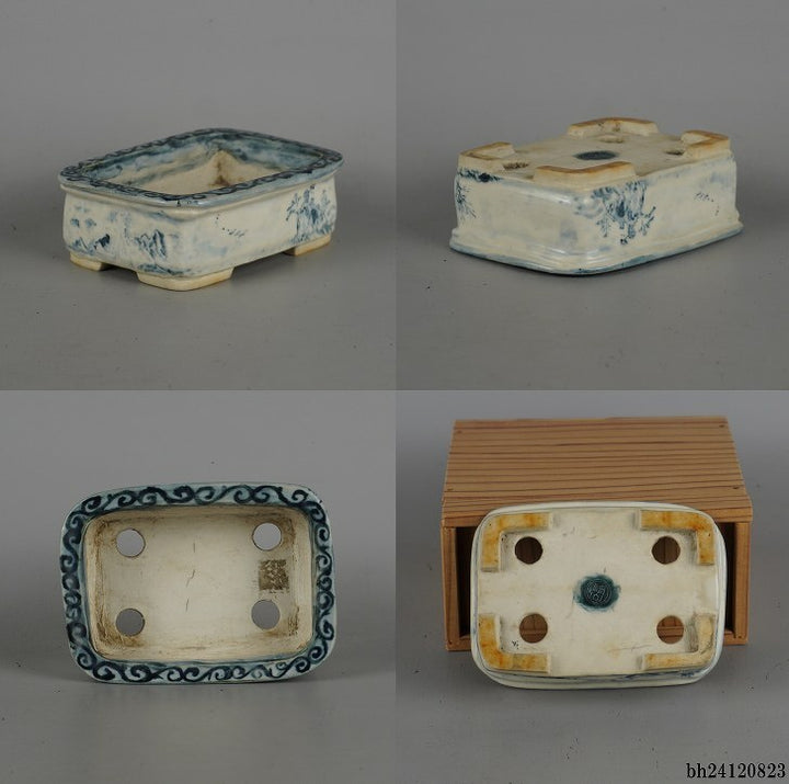盆栽鉢 嶋山 小型 長辺 約11.8cm 長方鉢 染付 山水図 箱付 布付 観賞用 現品 中古鉢 品名嶋山(箱・布)...