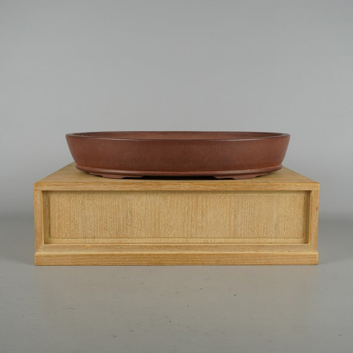中古盆栽鉢 平安 香翁 中型 長辺 約27.3cm 楕円鉢 切立 段足 下紐 朱泥 泥物 箱付 観賞用 中古鉢 x1198413418