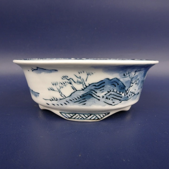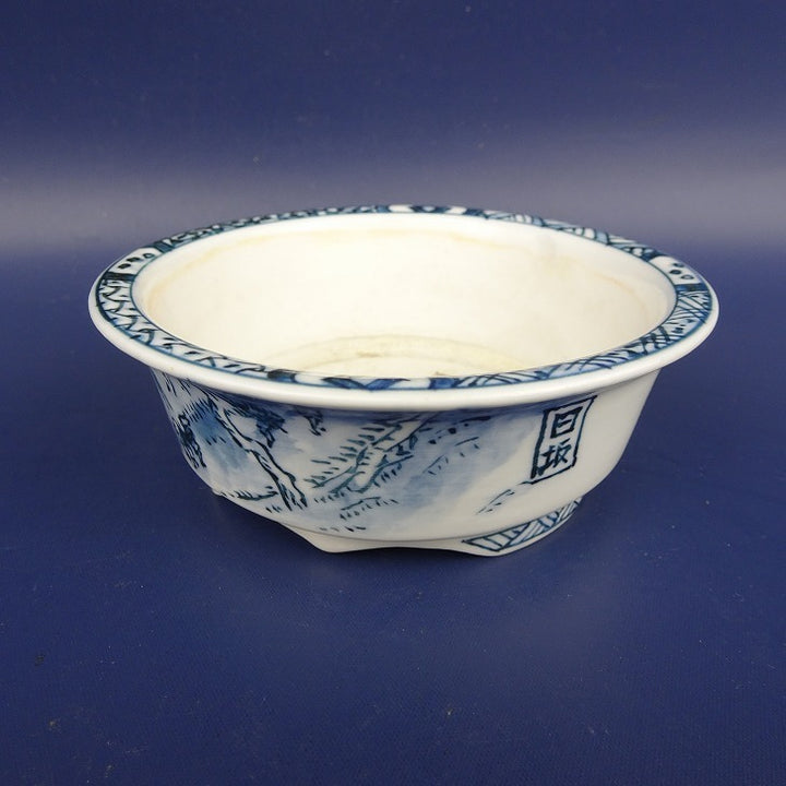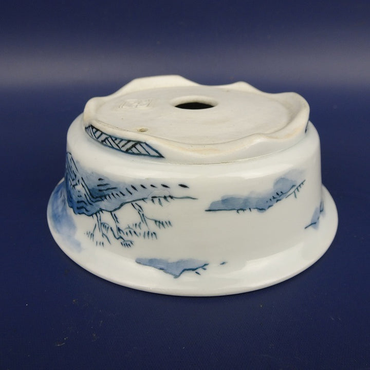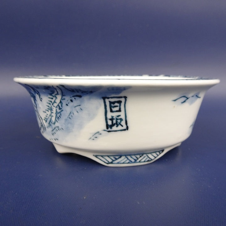 中古盆栽鉢 松本 松石 小型 長辺 約 9.8cm 丸鉢 外縁 染付 日坂 風景画 共箱 共布 中古鉢 x1198408941