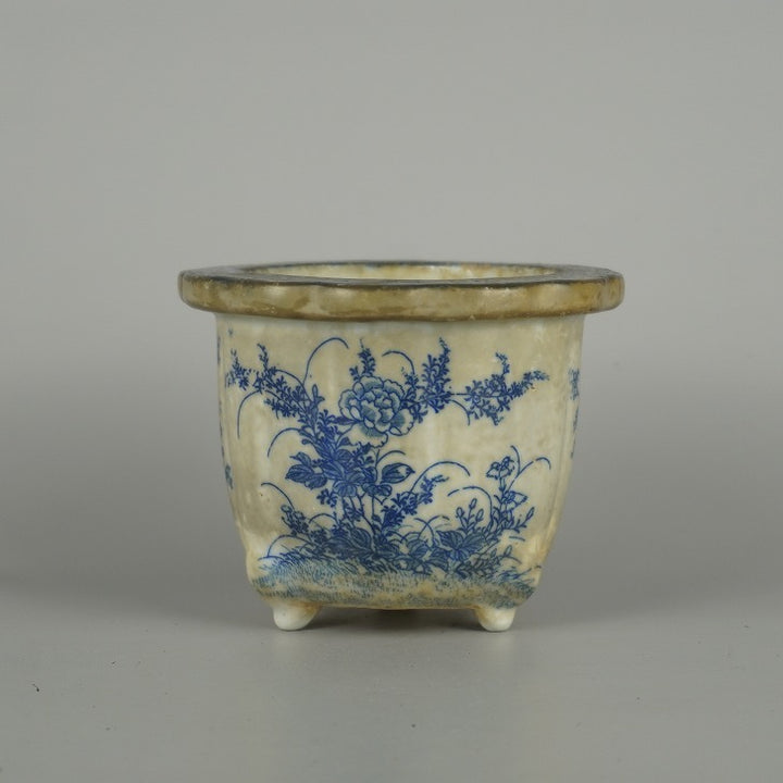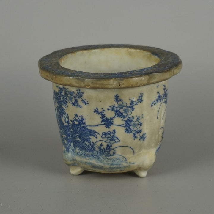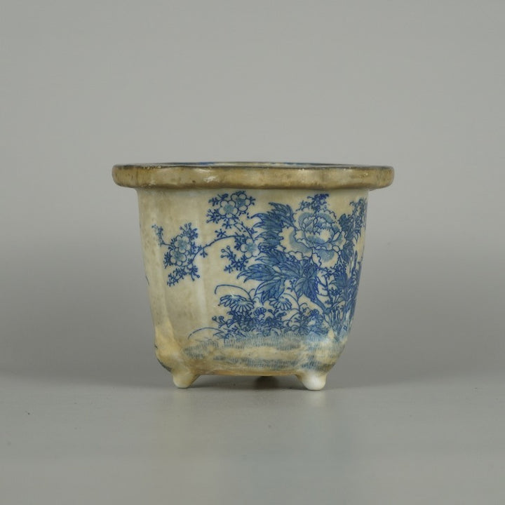 中古盆栽鉢 瀬戸焼 小型 長辺 約 12.2cm 輪花鉢 染付 花 植物 模様 観賞用 中古鉢 w1197995404