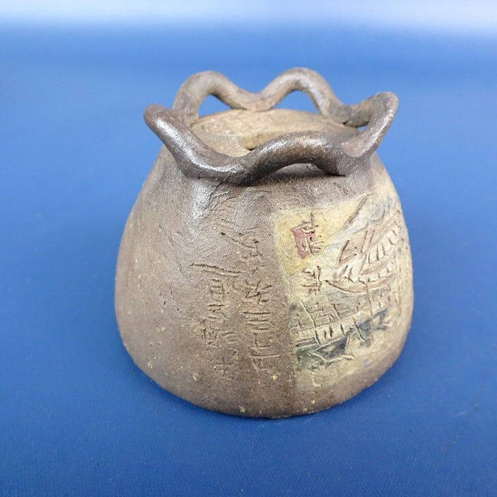 中古盆栽鉢 神戸 修 小鉢 長辺 約5.3cm 丸鉢 彫入 絵鉢 風景画 人物 馬 舟 泥鉢 箱付 観賞用 中古鉢 j1198408892