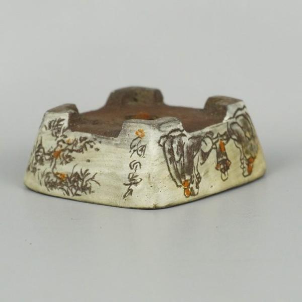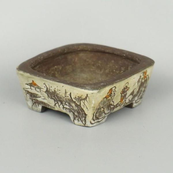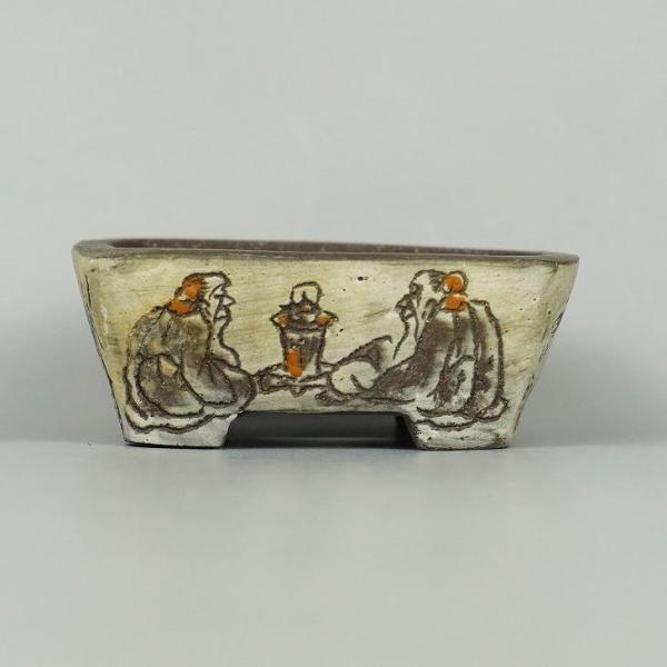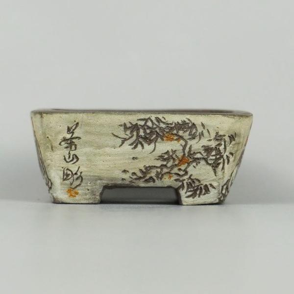 中古盆栽鉢 茶山 茶山作 茶山彫 小鉢 長辺 約 5.4cm 長方鉢 山水 人物図 釘彫り 観賞用 中古鉢 j1198419951