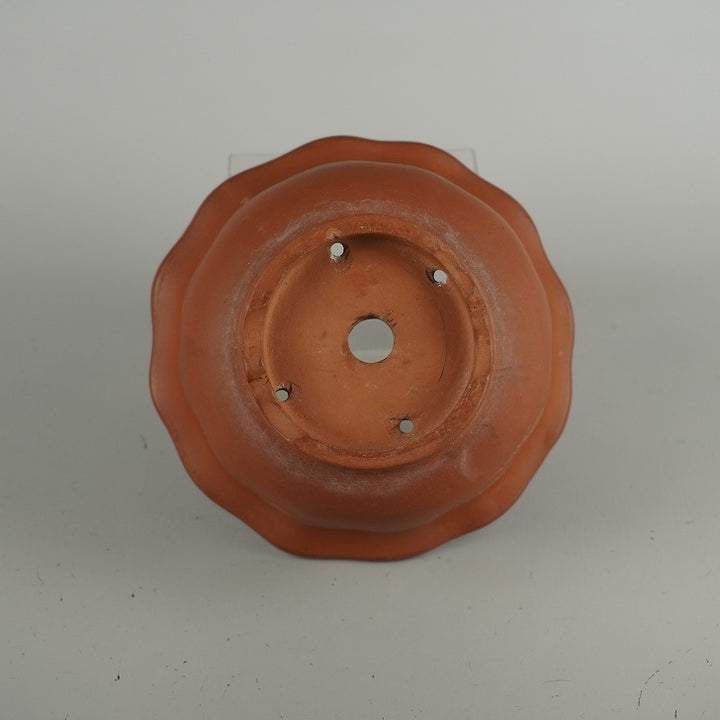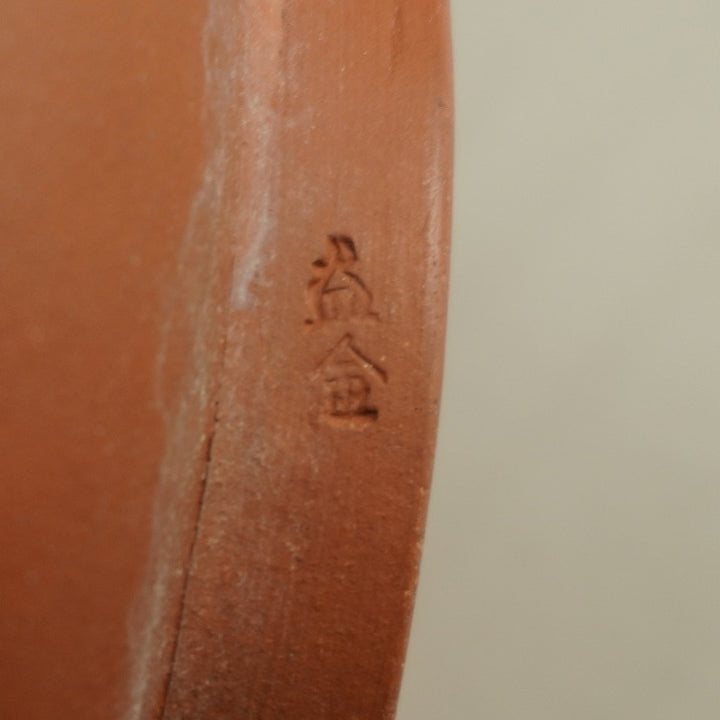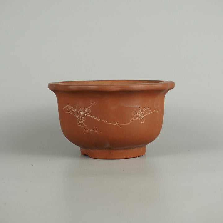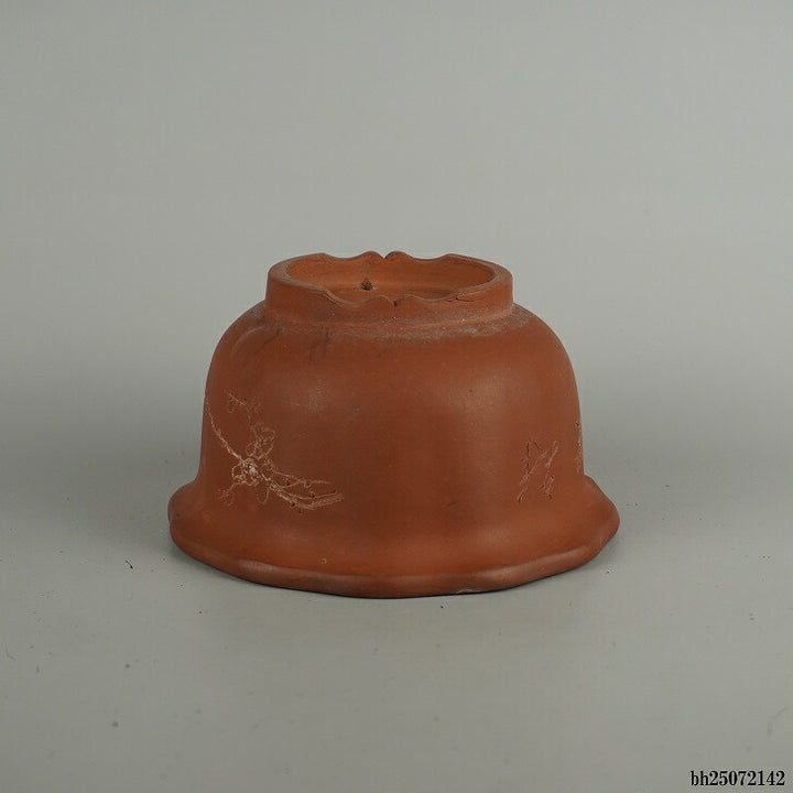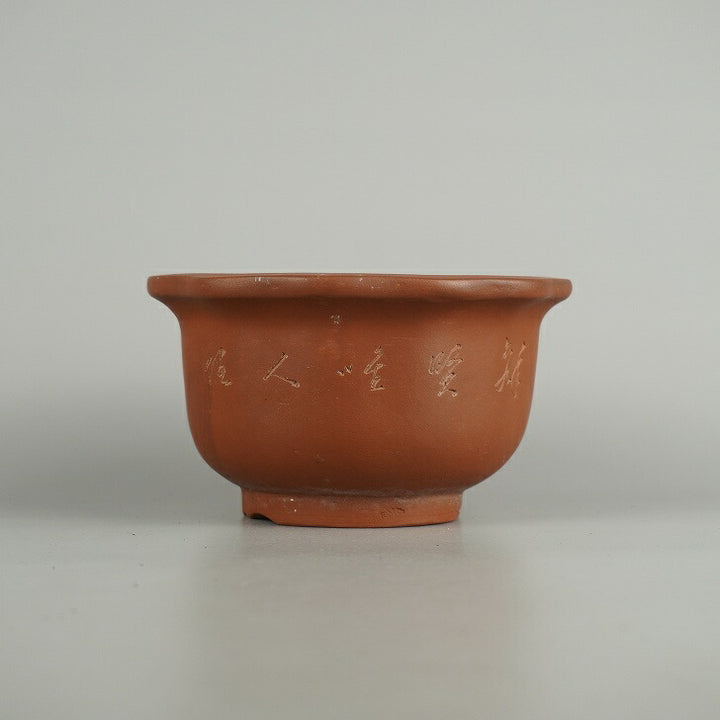 盆栽鉢 落款あり 小型 長辺 約 14.7cm 輪花鉢 外縁 彫入 梅 花 漢文 泥物 中国鉢 現品 中古鉢 品名落款あり...