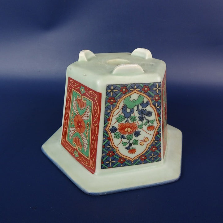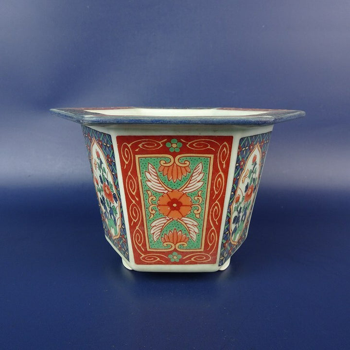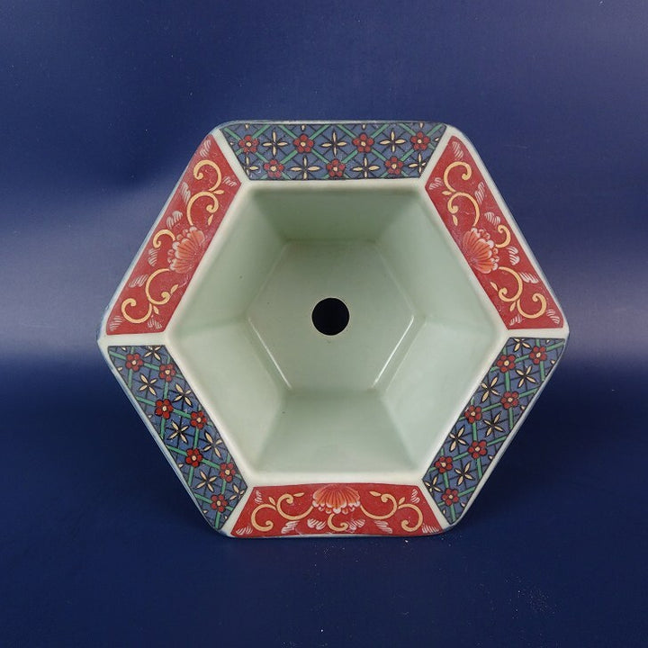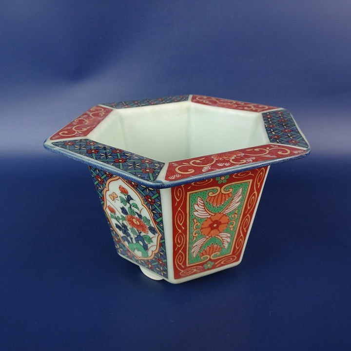 中古盆栽鉢 落款あり 小型 長辺 約13.5cm 六角鉢 外縁 色絵 花 蝶 絵鉢 中国鉢 中古鉢 l1198411175