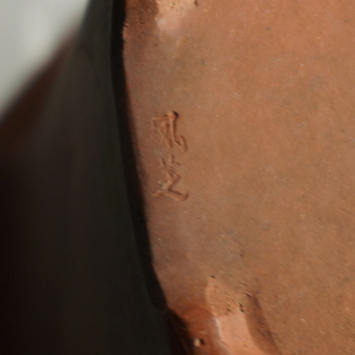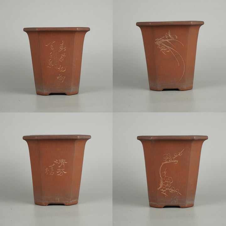盆栽鉢 落款あり 小型 高さ 約 12cm 正方鉢 隅切 彫入 梅 花 植物 漢文 泥物 中国鉢 現品 中古鉢 品名落款あり...