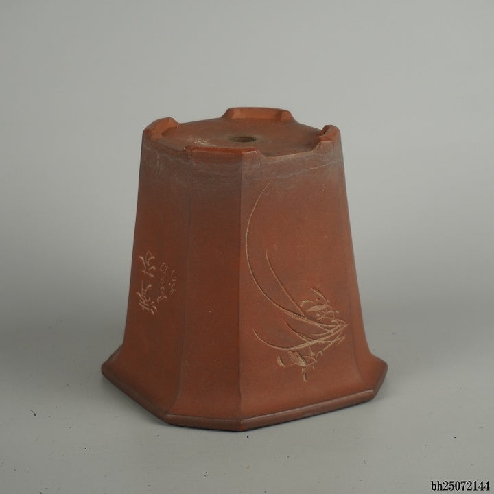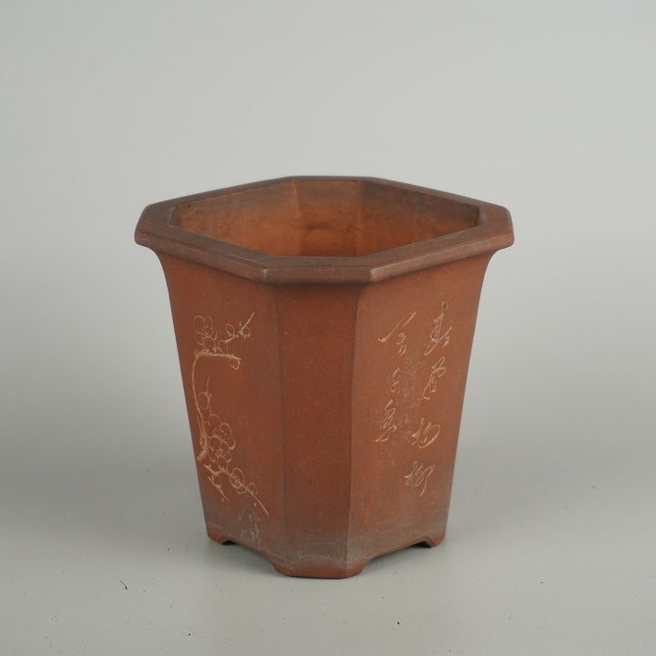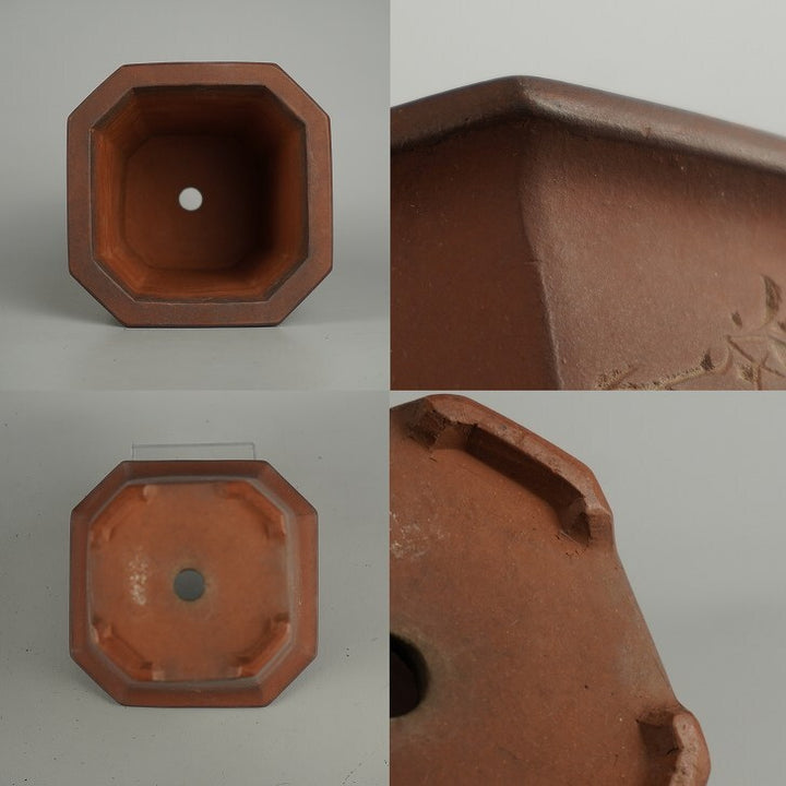 中古盆栽鉢 落款あり 小型 高さ 約 12cm 正方鉢 隅切 彫入 梅 花 植物 漢文 泥物 中国鉢 鑑賞 観賞用 中古鉢 f1209293457