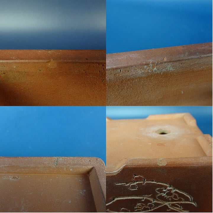 中古盆栽鉢 落款なし 受皿付 小型 長辺 約 18.3cm 長方鉢 釘彫 花 文字 釉薬 中古鉢 r1198402299