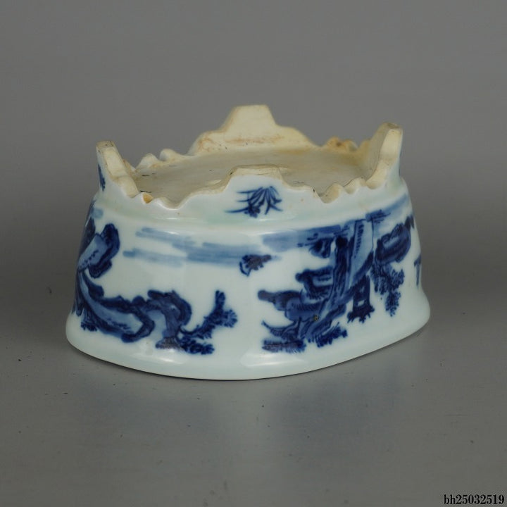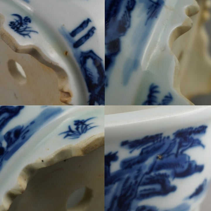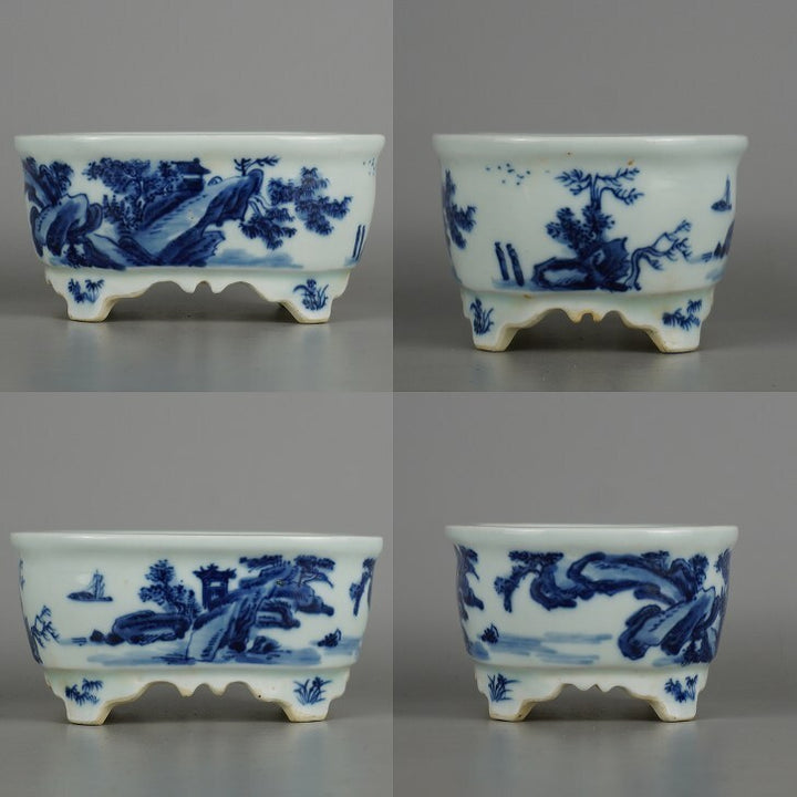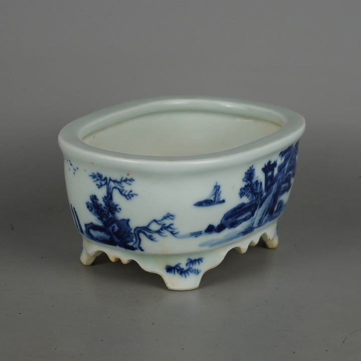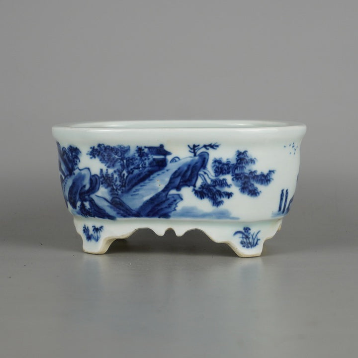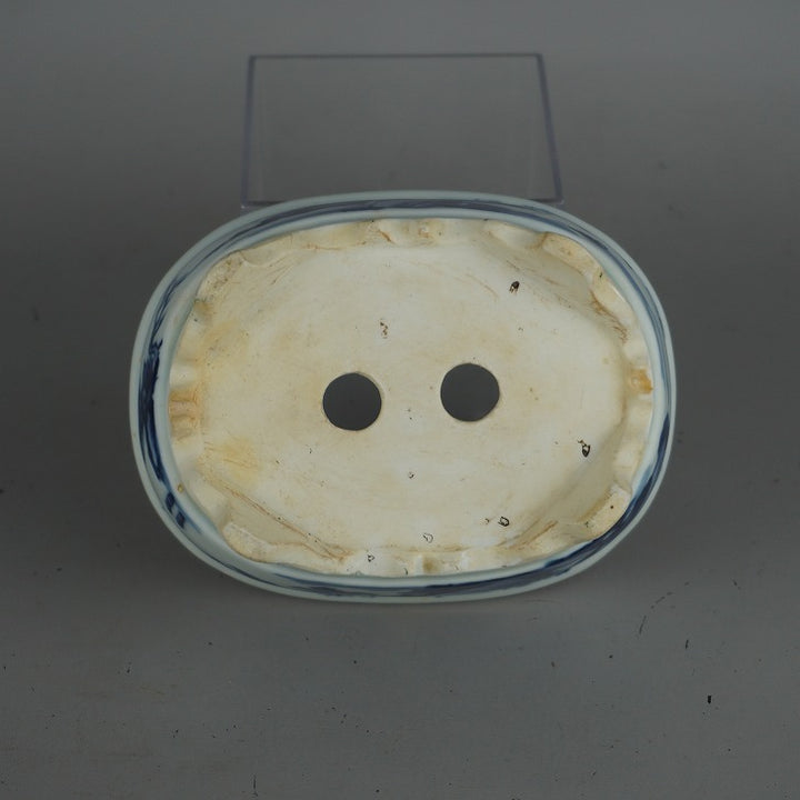 盆栽鉢 落款なし 小型 長辺 約 13.3cm 楕円鉢 山水図 観賞用 現品 中古鉢 品名落款なし...
