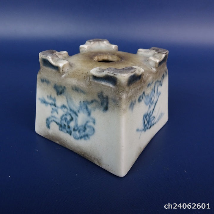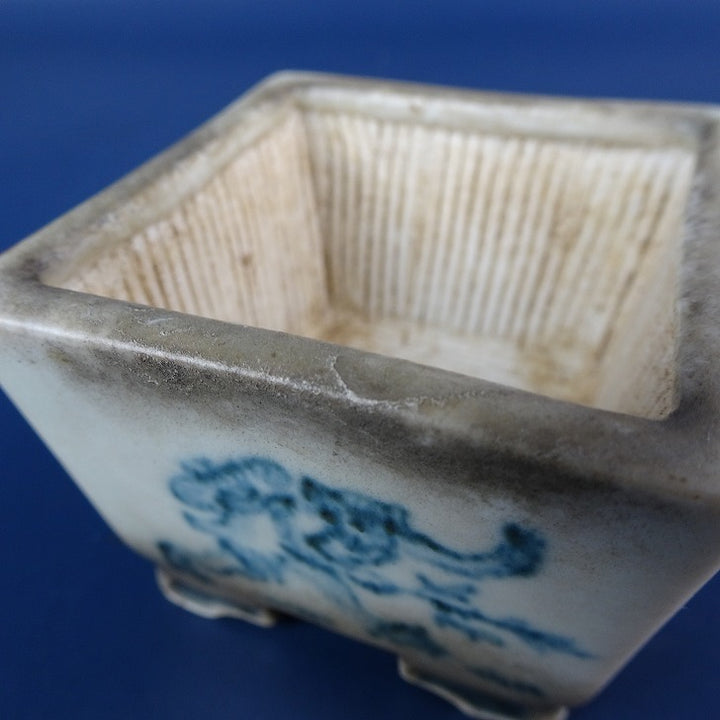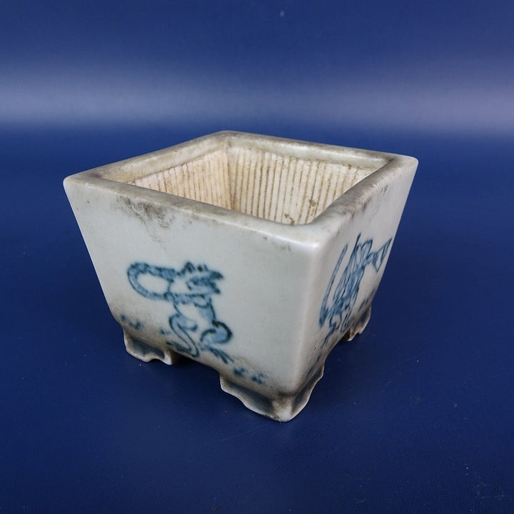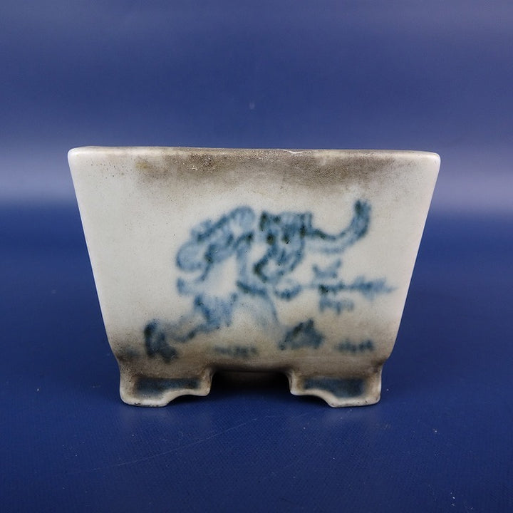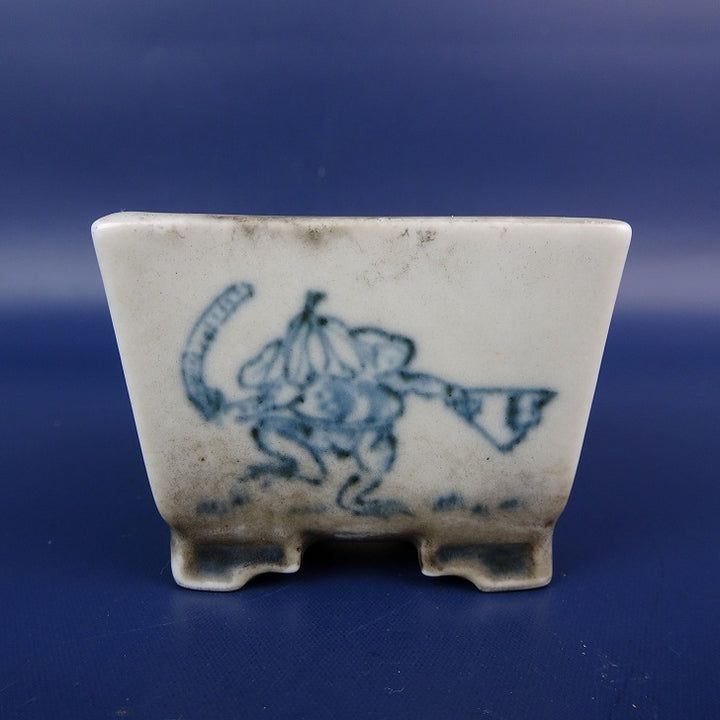 中古盆栽鉢 落款なし 小鉢 長辺 約5.3cm 正方鉢 染付 鳥獣戯画 蛙 兎 箱付 観賞用 中古鉢 e1198404598